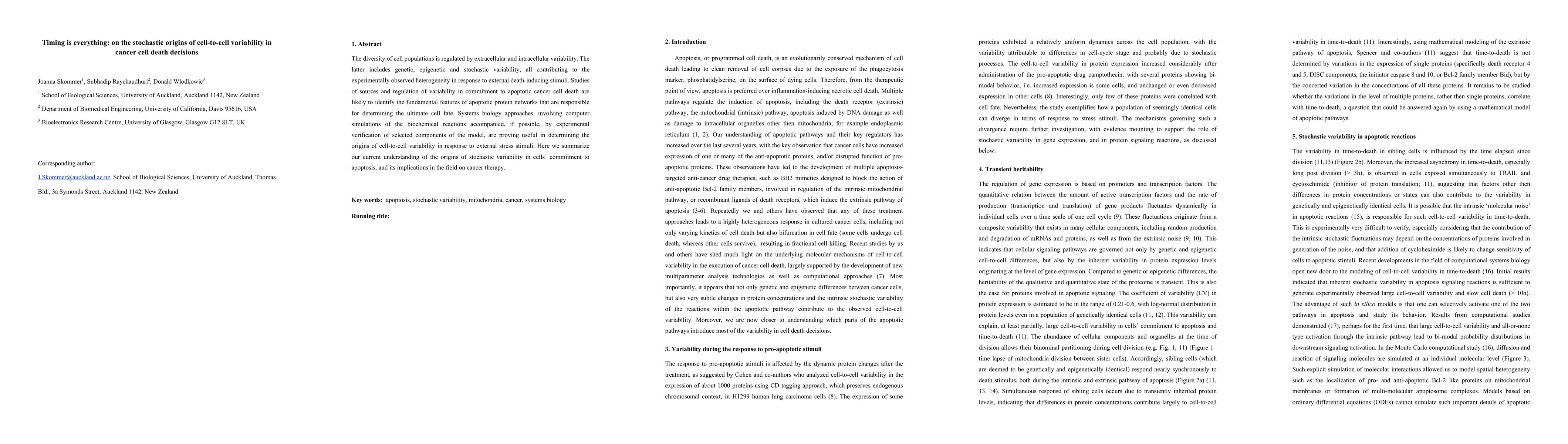 The diversity of cell populations is regulated by extracellular and intracellular variability. The latter includes genetic, epigenetic and stochastic variability, all contributing to the experimentally observed heterogeneity in response to external death-inducing stimuli. Studies of sources and regulation of variability in commitment to apoptotic cancer cell death are likely to identify the fundamental features of apoptotic protein networks that are responsible for determining the ultimate cell fate. Systems biology approaches, involving computer simulations of the biochemical reactions accompanied, if possible, by experimental verification of selected components of the model, are proving useful in determining the origins of cell-to-cell variability in response to external stress stimuli. Here we summarize our current understanding of the origins of stochastic variability in cells' commitment to apoptosis, and its implications in the field on cancer therapy.