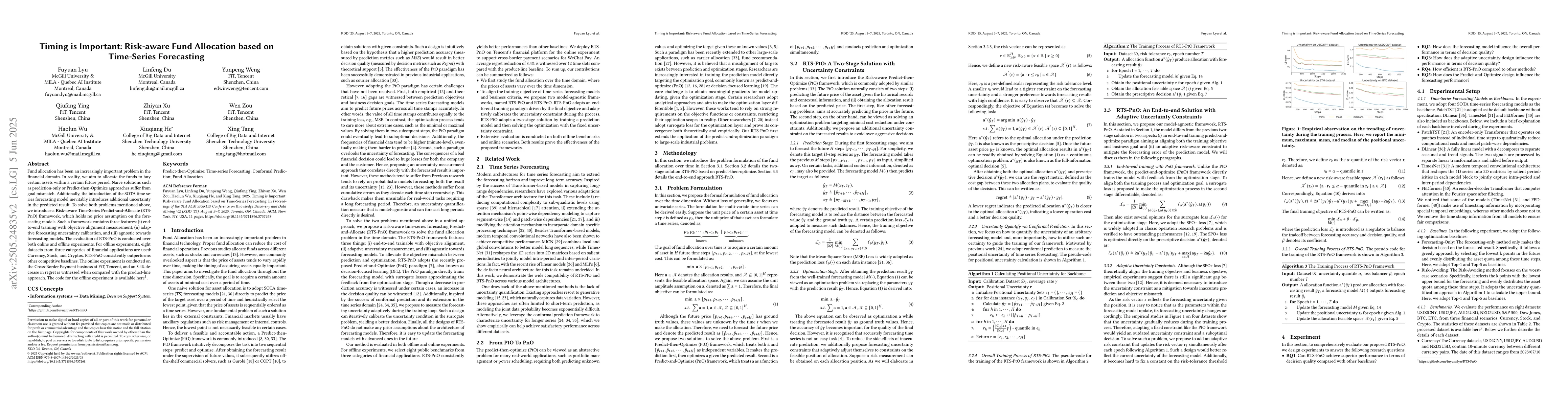 The research introduces Risk-aware Time-Series Predict-and-Allocate (RTS-PnO) framework for fund allocation, which integrates time-series forecasting with risk-aware decision-making, featuring end-to-end training, adaptive uncertainty calibration, and model-agnosticism.