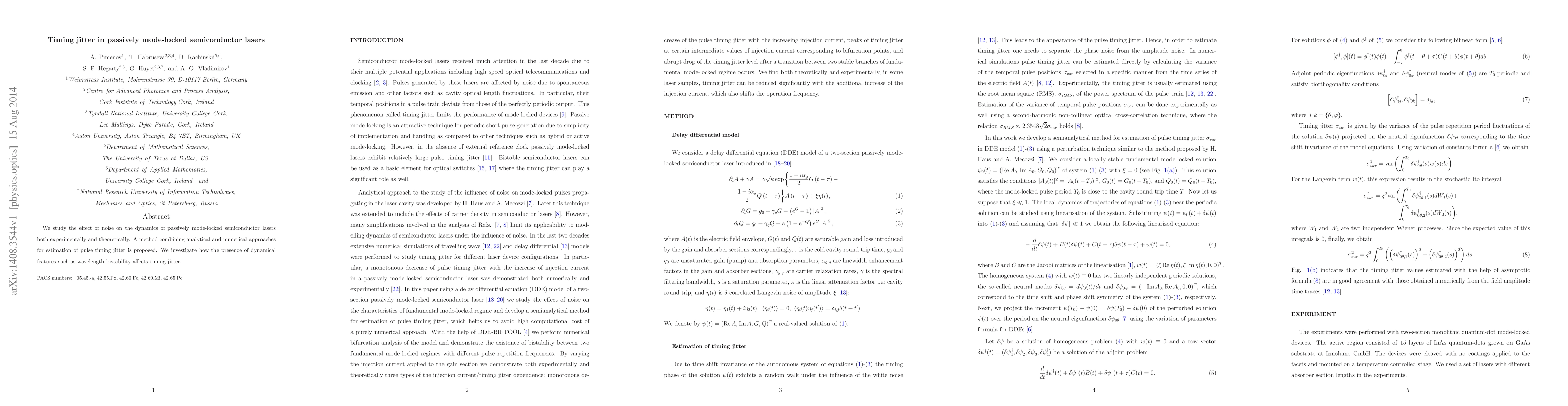 The paper presents a novel semi-analytical method for estimating timing jitter in passively mode-locked semiconductor lasers, combining analytical and numerical approaches.