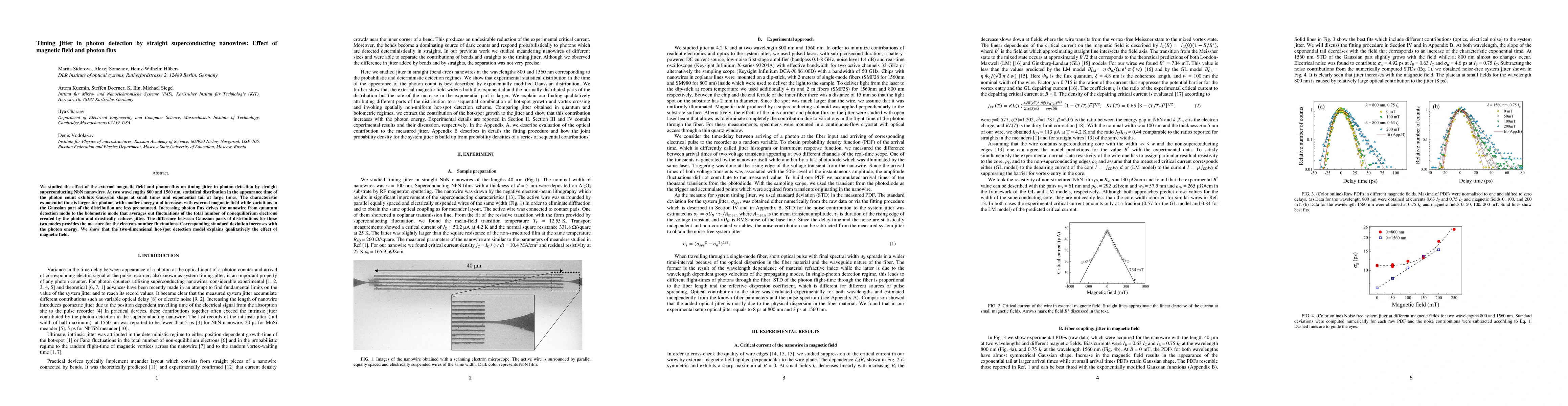 This study investigates the timing jitter in photon detection by straight superconducting NbN nanowires under varying magnetic fields and photon fluxes. The timing jitter exhibits Gaussian behavior at small times and exponential tails at large times, with the latter increasing with magnetic field and photon energy. Higher photon flux shifts the nanowire from quantum detection to bolometric mode, significantly reducing jitter by averaging electron fluctuations.