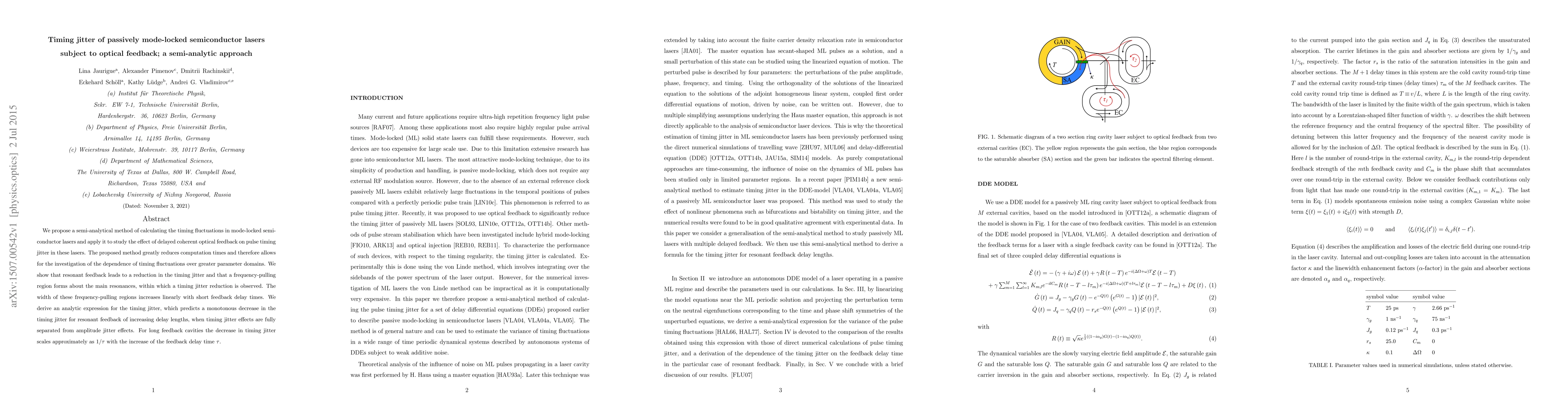 This paper proposes a semi-analytical method to calculate timing fluctuations in mode-locked semiconductor lasers under optical feedback, showing reduced computation times. It finds that resonant feedback reduces timing jitter, with a frequency-pulling region forming around main resonances, and derives an analytic expression for timing jitter that decreases with increasing feedback delay.