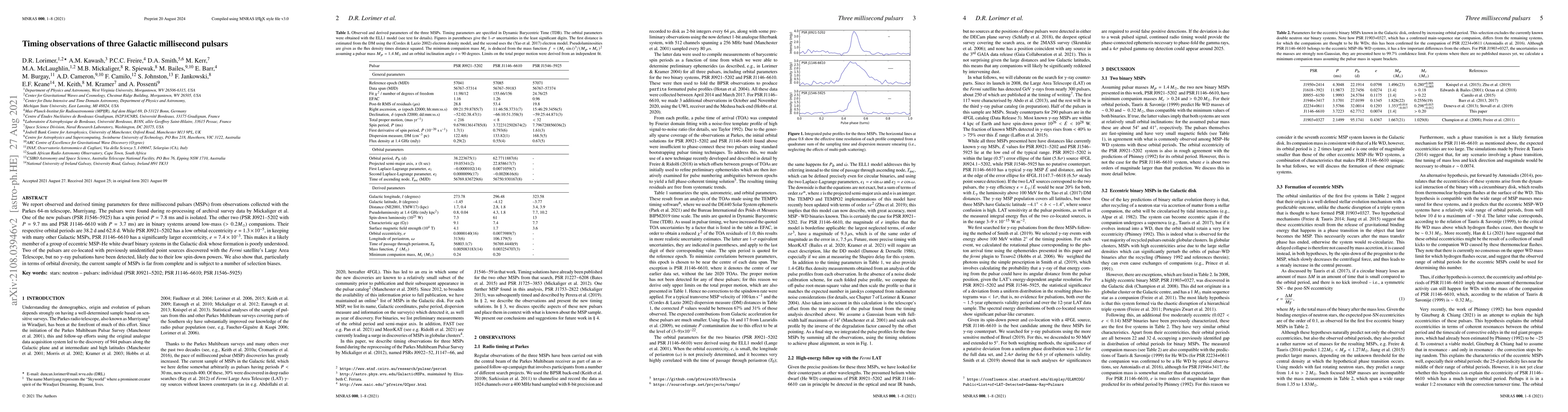 We report observed and derived timing parameters for three millisecond pulsars (MSPs) from observations collected with the Parkes 64-m telescope, Murriyang. The pulsars were found during re-processing of archival survey data by Mickaliger et al. One of the new pulsars (PSR J1546-5925) has a spin period $P=7.8$ ms and is isolated. The other two (PSR J0921-5202 with $P=9.7$ ms and PSR J1146-6610 with $P=3.7$ ms) are in binary systems around low-mass ($>0.2 M_{\odot}$) companions. Their respective orbital periods are $38$.2 d and $62.8$ d. While PSR J0921-5202 has a low orbital eccentricity $e=1.3 \times 10^{-5}$, in keeping with many other Galactic MSPs, PSR J1146-6610 has a significantly larger eccentricity, $e = 7.4 \times 10^{-3}$. This makes it a likely member of a group of eccentric MSP-He white dwarf binary systems in the Galactic disk whose formation is poorly understood. Two of the pulsars are co-located with previously unidentified point sources discovered with the Fermi satellite's Large Area Telescope, but no $\gamma$-ray pulsations have been detected, likely due to their low spin-down powers. We also show that, particularly in terms of orbital diversity, the current sample of MSPs is far from complete and is subject to a number of selection biases.