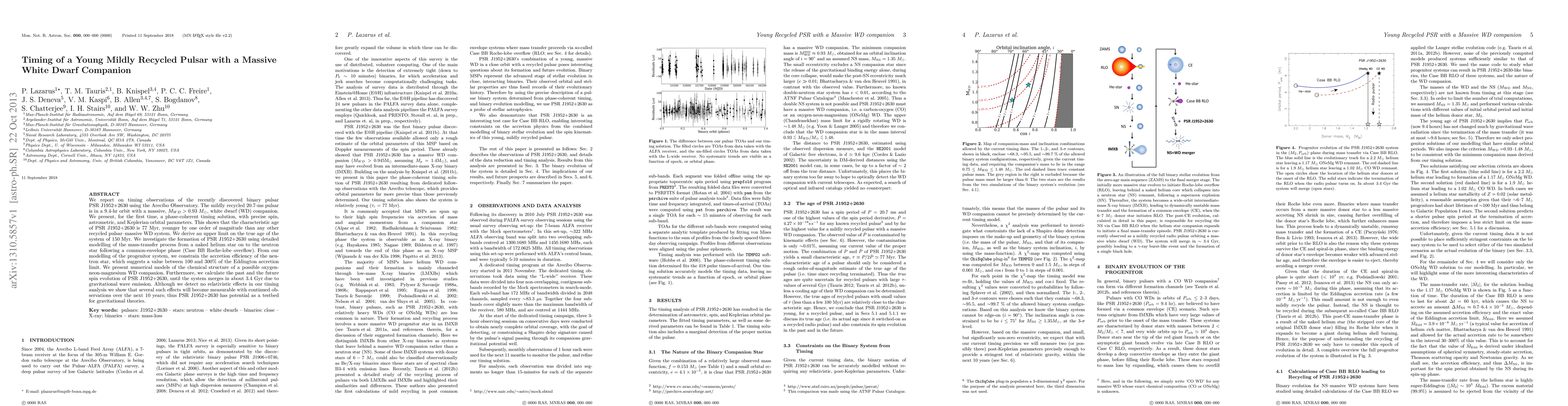 We report on timing observations of the recently discovered binary pulsar PSR J1952+2630 using the Arecibo Observatory. The mildly recycled 20.7-ms pulsar is in a 9.4-hr orbit with a massive, M_WD > 0.93 M_sun, white dwarf (WD) companion. We present, for the first time, a phase-coherent timing solution, with precise spin, astrometric, and Keplerian orbital parameters. This shows that the characteristic age of PSR J1952+2630 is 77 Myr, younger by one order of magnitude than any other recycled pulsar-massive WD system. We derive an upper limit on the true age of the system of 50 Myr. We investigate the formation of PSR J1952+2630 using detailed modelling of the mass-transfer process from a naked helium star on to the neutron star following a common-envelope phase (Case BB Roche-lobe overflow). From our modelling of the progenitor system, we constrain the accretion efficiency of the neutron star, which suggests a value between 100 and 300% of the Eddington accretion limit. We present numerical models of the chemical structure of a possible oxygen-neon-magnesium WD companion. Furthermore, we calculate the past and the future spin evolution of PSR J1952+2630, until the system merges in about 3.4 Gyr due to gravitational wave emission. Although we detect no relativistic effects in our timing analysis we show that several such effects will become measurable with continued observations over the next 10 years; thus PSR J1952+2630 has potential as a testbed for gravitational theories.
