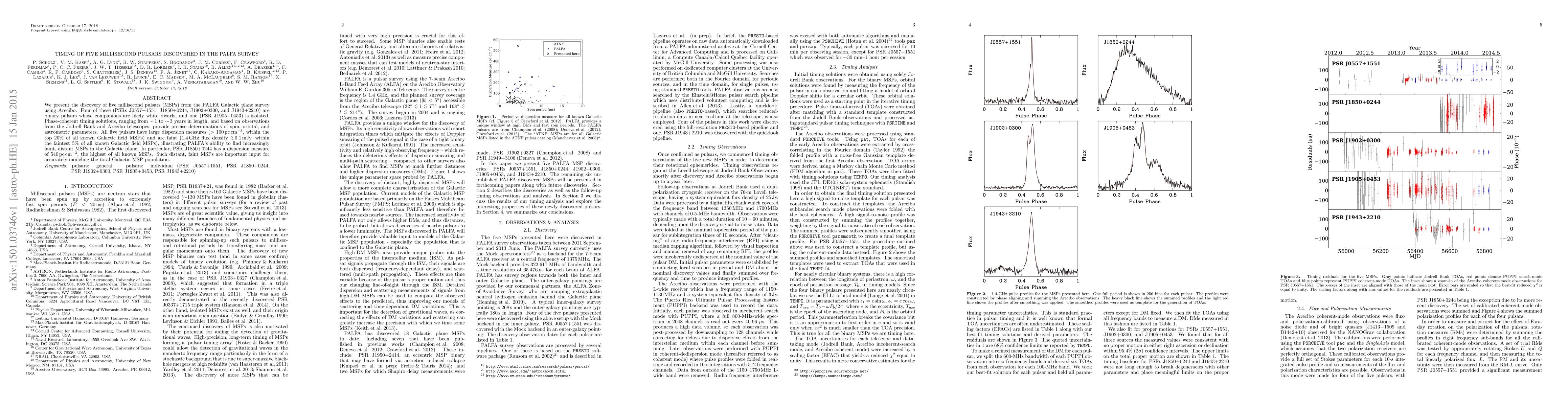 The PALFA survey discovered five millisecond pulsars, four in binary systems likely with white dwarf companions and one isolated. Precise timing solutions reveal detailed spin, orbital, and astrometric parameters, highlighting the survey's capability to detect faint and distant pulsars, with PSR J1850+0244 having the highest dispersion measure among known MSPs.