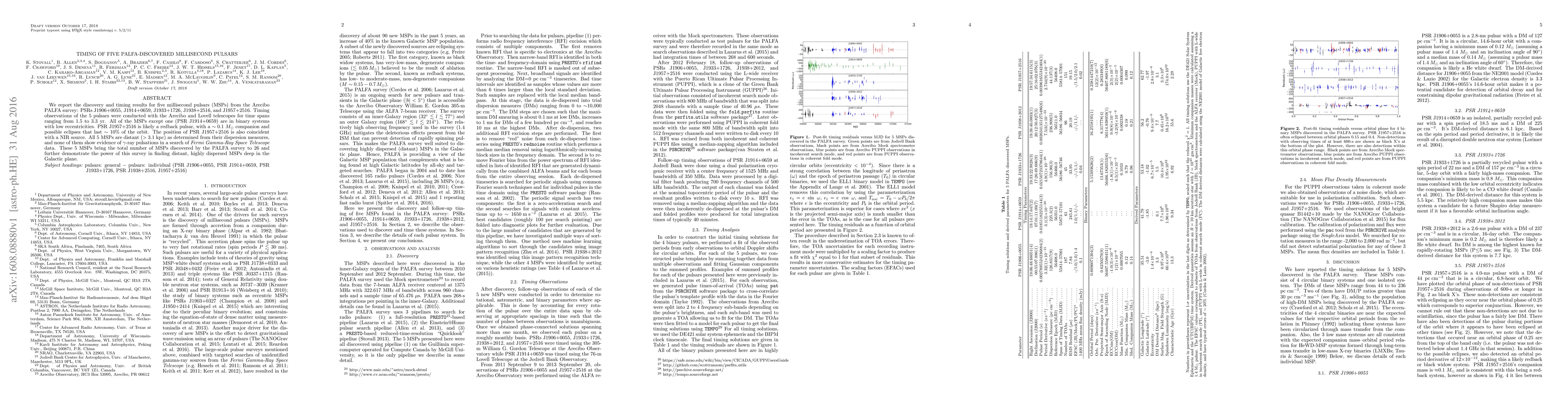 This paper reports the discovery and timing results for five new millisecond pulsars (MSPs) from the Arecibo PALFA survey, expanding the total number of MSPs found by the survey to 26. The pulsars are located in binary systems, with one showing characteristics of a redback pulsar, and all are distant with no evidence of gamma-ray pulsations.