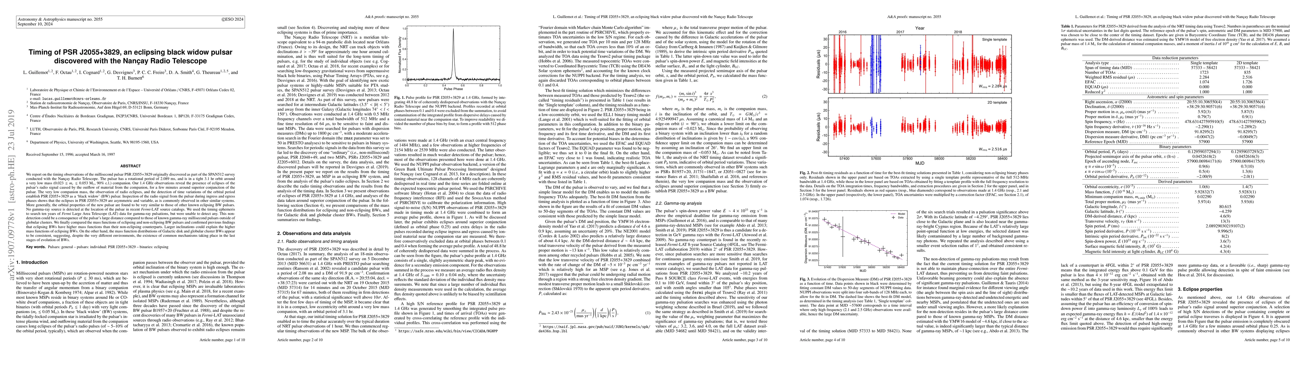 This paper reports on the timing observations of the millisecond pulsar PSR J2055+3829, which exhibits eclipses due to material outflow from its low-mass companion, classifying it as a "black widow" pulsar. The study also finds no gamma-ray emissions and confirms that eclipsing black widow pulsars have higher mass functions than non-eclipsing ones.