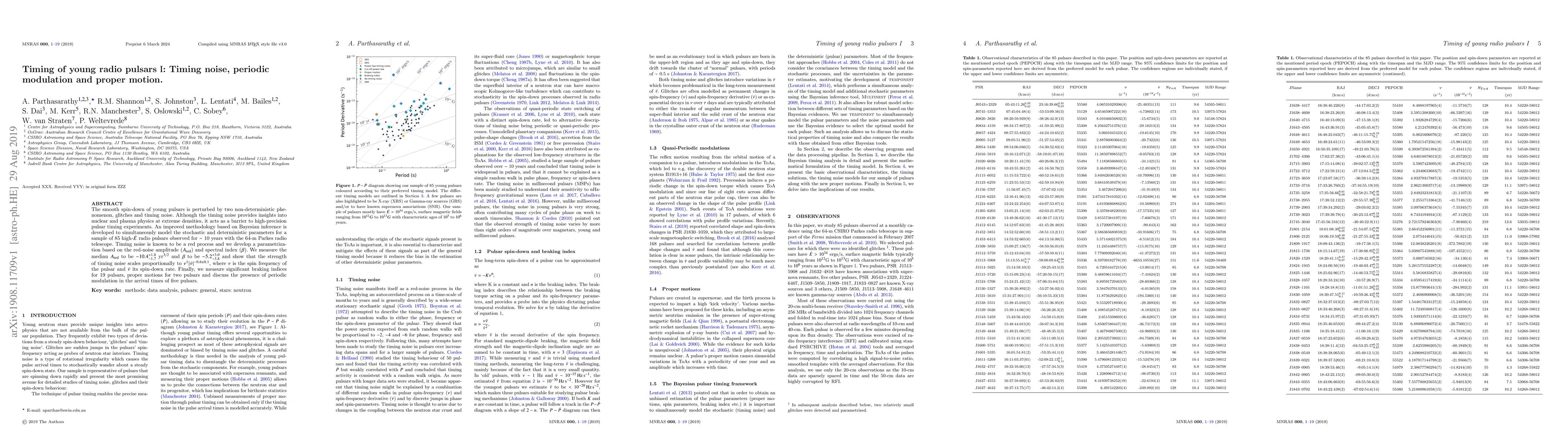 The smooth spin-down of young pulsars is perturbed by two non-deterministic phenomenon, glitches and timing noise. Although the timing noise provides insights into nuclear and plasma physics at extreme densities, it acts as a barrier to high-precision pulsar timing experiments. An improved methodology based on Bayesian inference is developed to simultaneously model the stochastic and deterministic parameters for a sample of 85 high-$\dot{E}$ radio pulsars observed for $\sim$ 10 years with the 64-m Parkes radio telescope. Timing noise is known to be a red process and we develop a parametrization based on the red-noise amplitude ($A_{\rm red}$) and spectral index ($\beta$). We measure the median $A_{\rm red}$ to be $-10.4^{+1.8}_{-1.7}$ yr$^{3/2}$ and $\beta$ to be $-5.2^{+3.0}_{-3.8}$ and show that the strength of timing noise scales proportionally to $\nu^{1}|\dot{\nu}|^{-0.6\pm0.1}$, where $\nu$ is the spin frequency of the pulsar and $\dot{\nu}$ its spin-down rate. Finally, we measure significant braking indices for 19 pulsars, proper motions for two pulsars and discuss the presence of periodic modulation in the arrival times of five pulsars.
