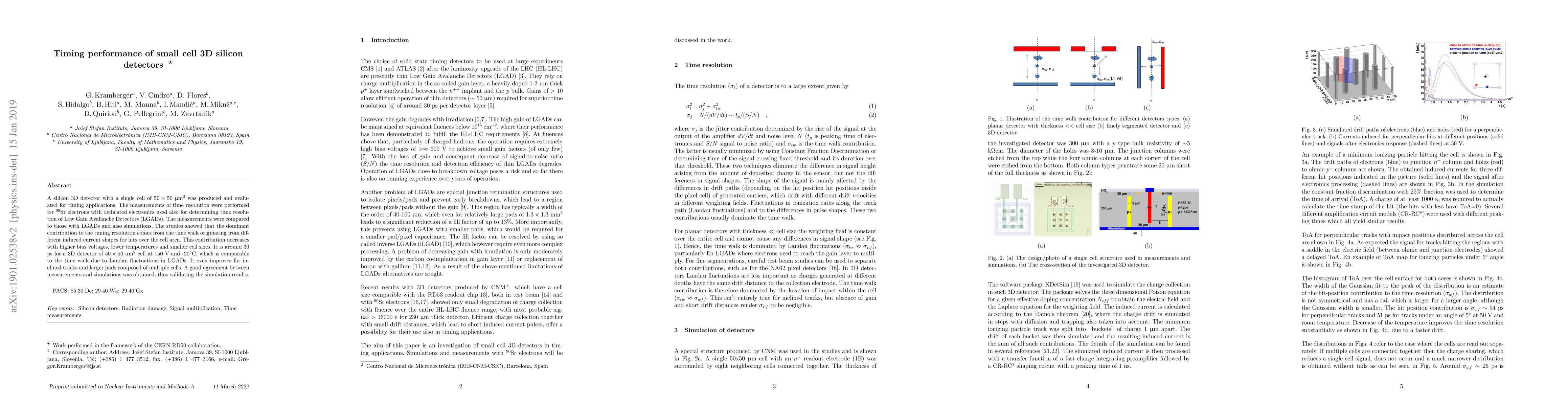 A silicon 3D detector with a single cell of 50x50 um2 was produced and evaluated for timing applications. The measurements of time resolution were performed for 90Sr electrons with dedicated electronics used also for determining time resolution of Low Gain Avalanche Detectors (LGADs). The measurements were compared to those with LGADs and also simulations. The studies showed that the dominant contribution to the timing resolution comes from the time walk originating from different induced current shapes for hits over the cell area. This contribution decreases with higher bias voltages, lower temperatures and smaller cell sizes. It is around 30 ps for a 3D detector of 50x50 um2 cell at 150 V and -20C, which is comparable to the time walk due to Landau fluctuations in LGADs. It even improves for inclined tracks and larger pads composed of multiple cells. A good agreement between measurements and simulations was obtained, thus validating the simulation results.