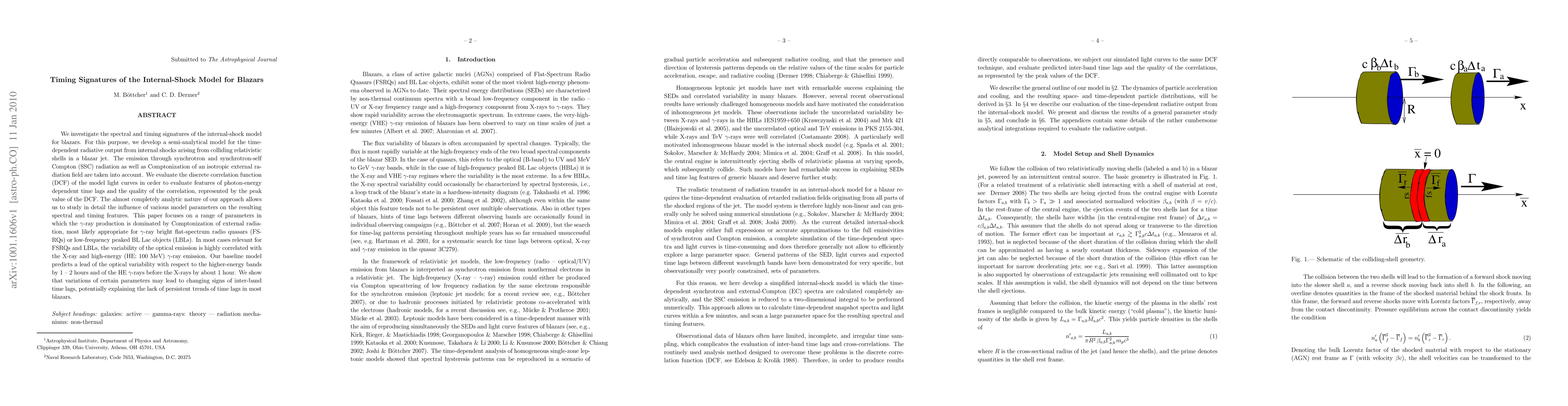 This paper develops a semi-analytical model to study the spectral and timing signatures of the internal-shock model for blazars, focusing on the influence of Comptonization of external radiation. The model predicts optical emission variability leading higher-energy bands by 1-2 hours, and high-energy gamma rays preceding X-rays by about 1 hour, potentially explaining the variability in observed time lags among blazars.
