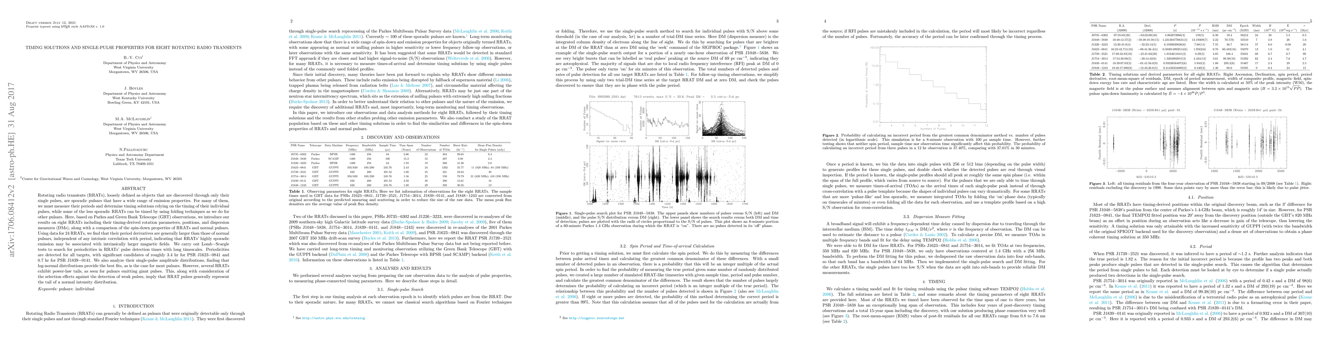 This study investigates eight rotating radio transients (RRATs) using Parkes and Green Bank Telescope observations, detailing their timing solutions, rotation parameters, and dispersion measures. The research finds that RRATs exhibit larger period derivatives compared to normal pulsars, suggesting a link to higher magnetic fields. Periodicities in pulse detection times were detected, with notable candidates around 3.4 and 0.7 hours, and single-pulse amplitude distributions generally fit log-normal models, though some show power-law tails indicative of giant pulses.