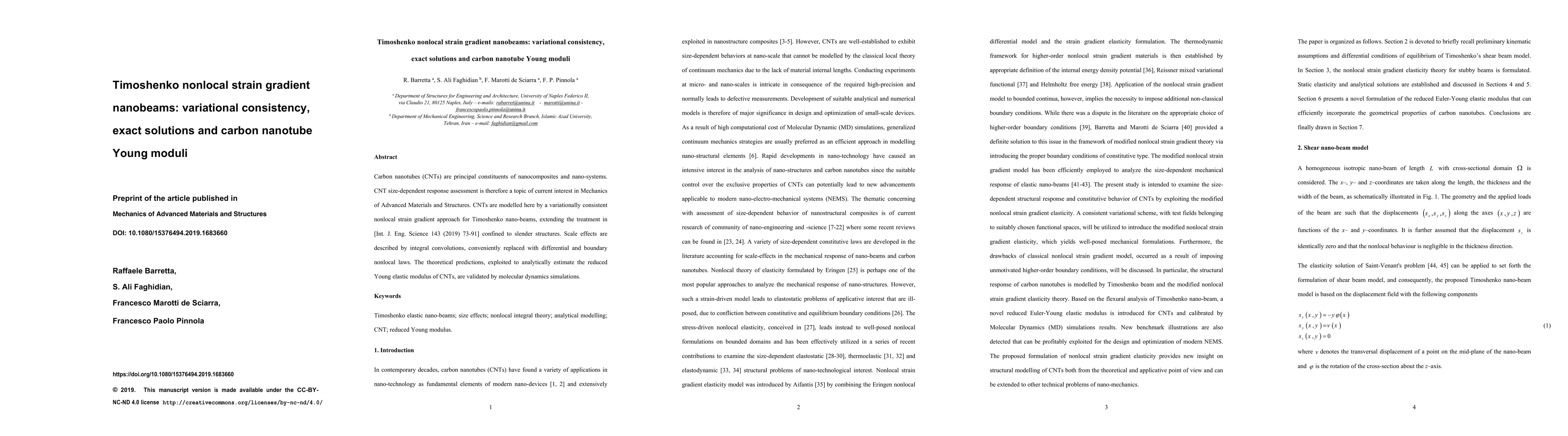 This paper develops a variationally consistent nonlocal strain gradient model for Timoshenko nanobeams to assess size-dependent behavior of carbon nanotubes (CNTs). The model is validated against molecular dynamics simulations to estimate the reduced Young modulus of CNTs.