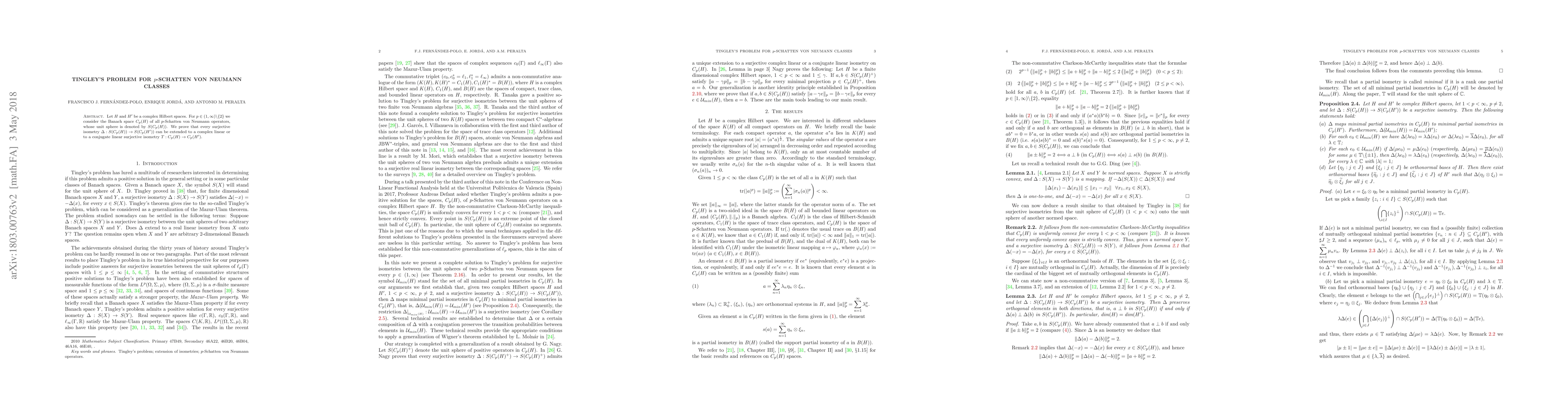 The paper shows that every surjective isometry from the unit sphere of p-Schatten von Neumann operators can be extended to a conjugate linear surjective isometry between the full spaces of p-Schatten von Neumann operators.
