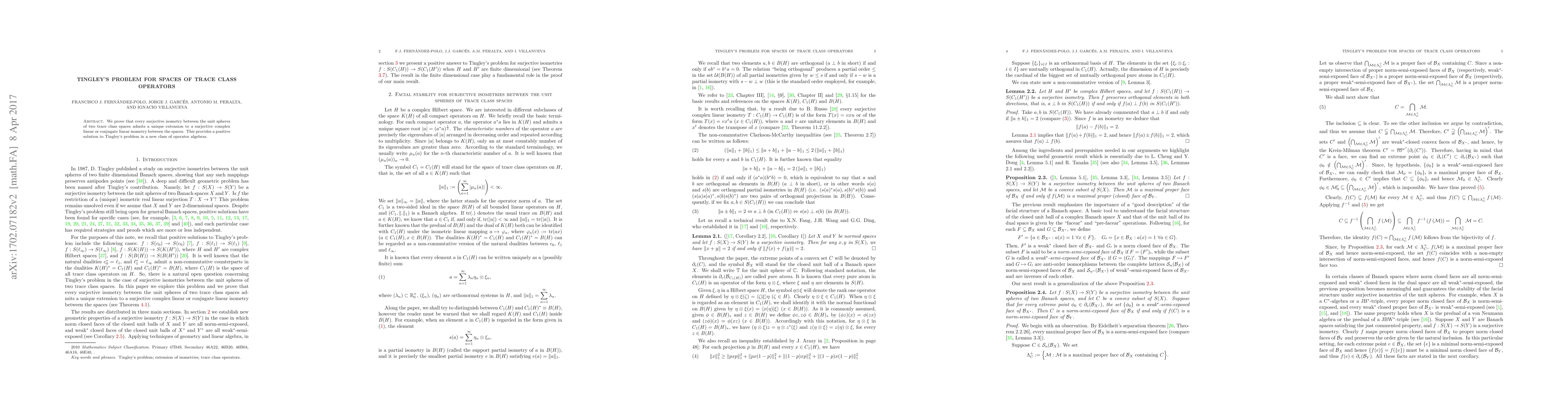 We prove that every surjective isometry between the unit spheres of two trace class spaces admits a unique extension to a surjective complex linear or conjugate linear isometry between the spaces. This provides a positive solution to Tingley's problem in a new class of operator algebras.