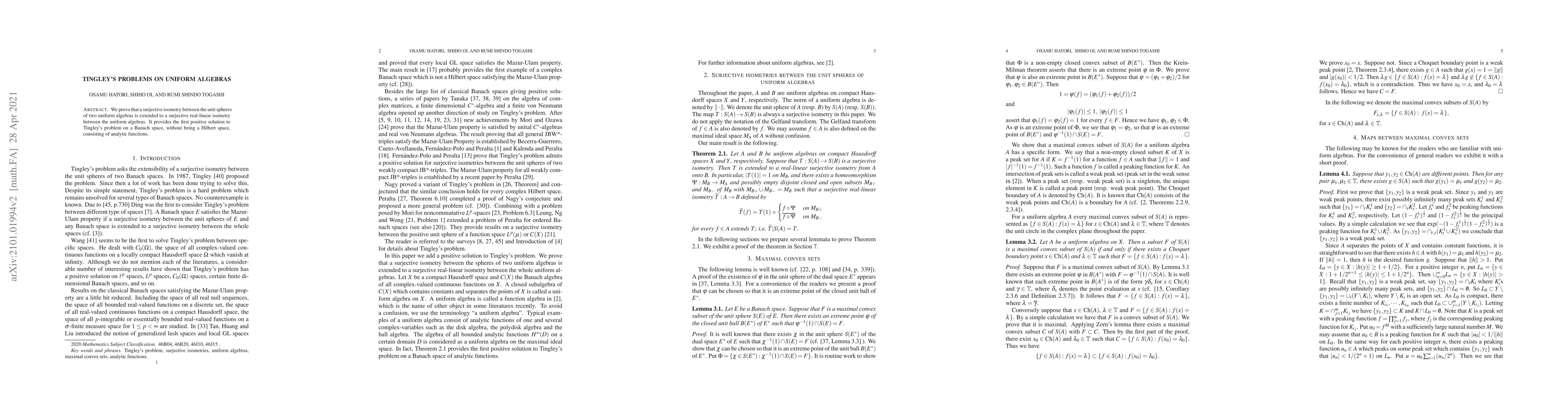 Summary: The paper proves that a surjective isometry between the unit spheres of two uniform algebras extends to a surjective real-linear isometry, offering the first positive resolution to Tingley's problem regarding Banach spaces of analytic functions.