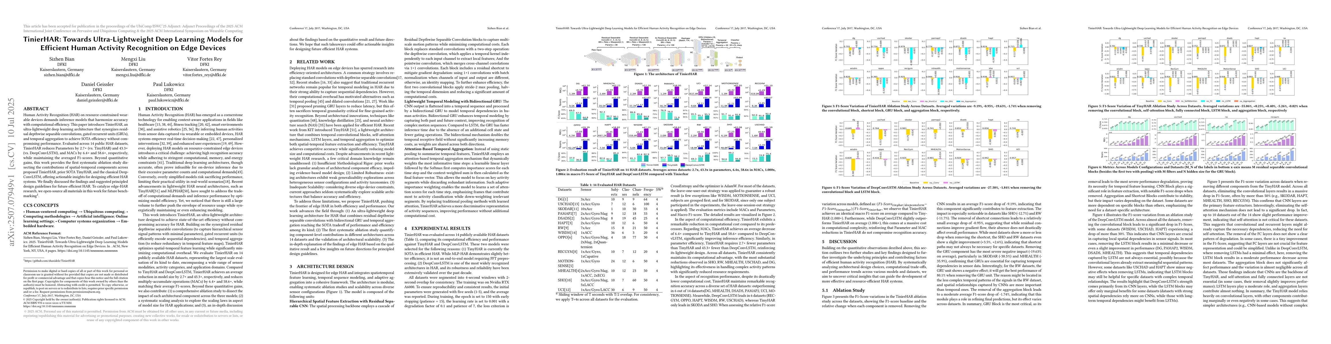 Human Activity Recognition (HAR) on resource-constrained wearable devices demands inference models that harmonize accuracy with computational efficiency. This paper introduces TinierHAR, an ultra-lightweight deep learning architecture that synergizes residual depthwise separable convolutions, gated recurrent units (GRUs), and temporal aggregation to achieve SOTA efficiency without compromising performance. Evaluated across 14 public HAR datasets, TinierHAR reduces Parameters by 2.7x (vs. TinyHAR) and 43.3x (vs. DeepConvLSTM), and MACs by 6.4x and 58.6x, respectively, while maintaining the averaged F1-scores. Beyond quantitative gains, this work provides the first systematic ablation study dissecting the contributions of spatial-temporal components across proposed TinierHAR, prior SOTA TinyHAR, and the classical DeepConvLSTM, offering actionable insights for designing efficient HAR systems. We finally discussed the findings and suggested principled design guidelines for future efficient HAR. To catalyze edge-HAR research, we open-source all materials in this work for future benchmarking\footnote{https://github.com/zhaxidele/TinierHAR}