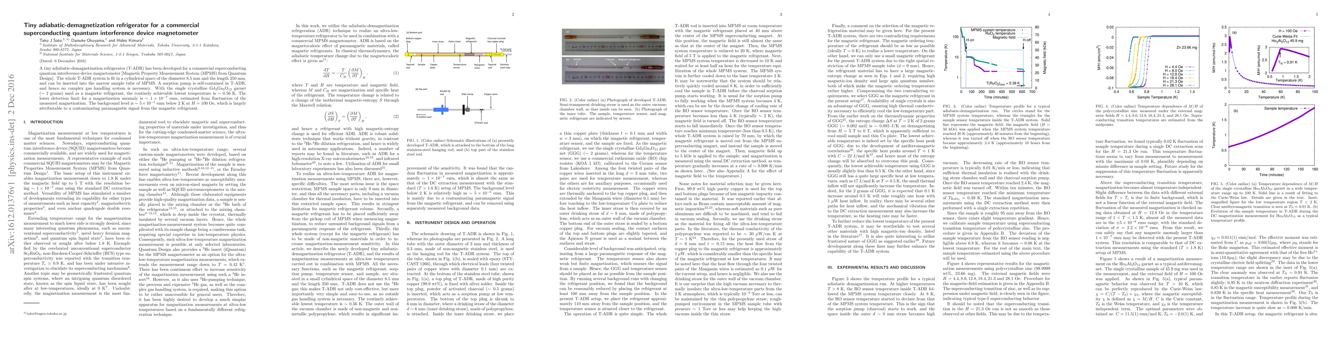 This paper describes the development of a compact adiabatic-demagnetization refrigerator (T-ADR) for a commercial SQUID magnetometer, enabling it to fit within the narrow sample tube of the MPMS system. The T-ADR uses a self-contained sorption pump and a single crystalline Gd$_3$Ga$_5$O$_{12}$ garnet to achieve temperatures as low as 0.56 K.