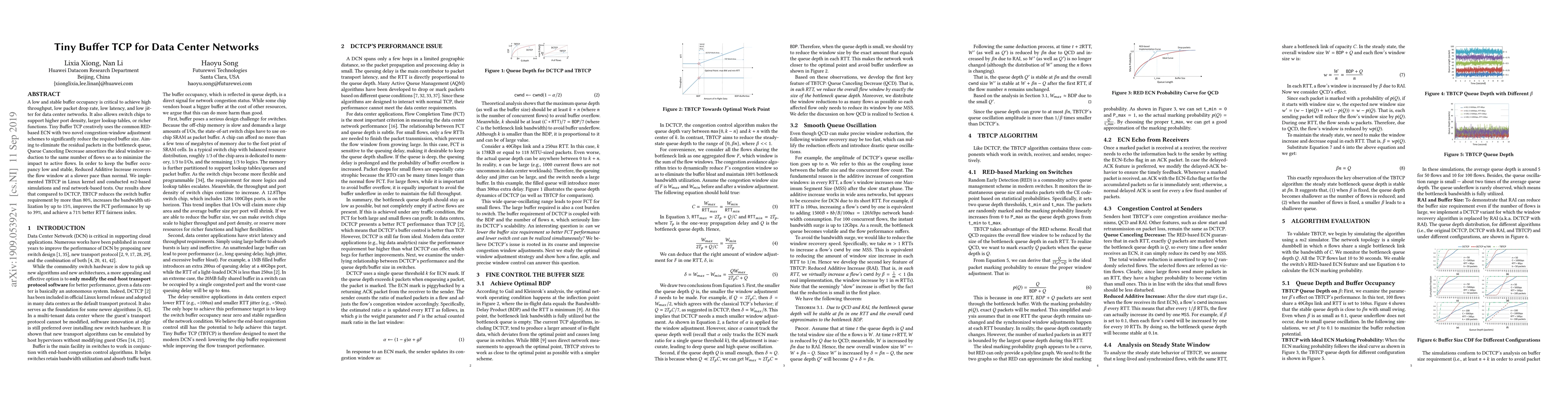 Tiny Buffer TCP (TBCTP) employs RED-based ECN and two congestion-window adjustment schemes to drastically reduce buffer size in data centers, achieving higher throughput, lower latency, and better fairness compared to DCTCP. TBTCP's Queue Canceling Decrease and Reduced Additive Increase methods effectively minimize buffer occupancy and improve network performance.
