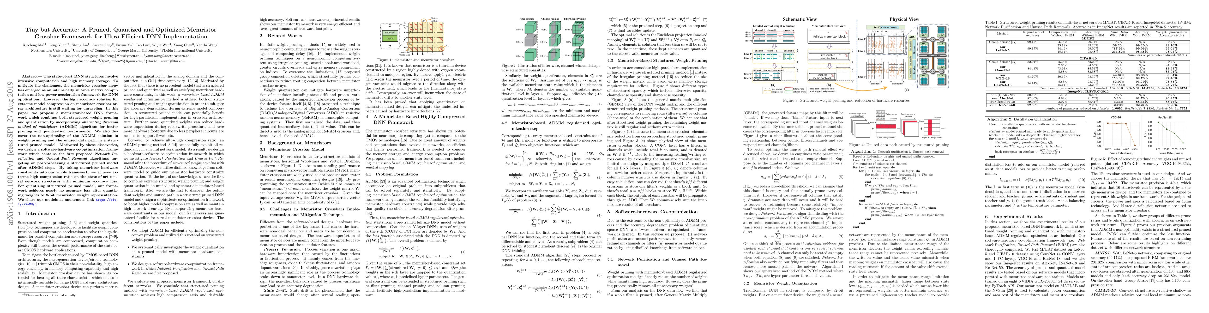 This paper proposes a memristor-based framework for ultra-efficient DNN implementation, combining weight pruning, quantization, and software-hardware co-optimization to achieve extreme model compression with minimal accuracy loss. The framework includes novel Network Purification and Unused Path Removal algorithms to refine the pruned model, resulting in high compression ratios and nearly no loss in accuracy after quantization.