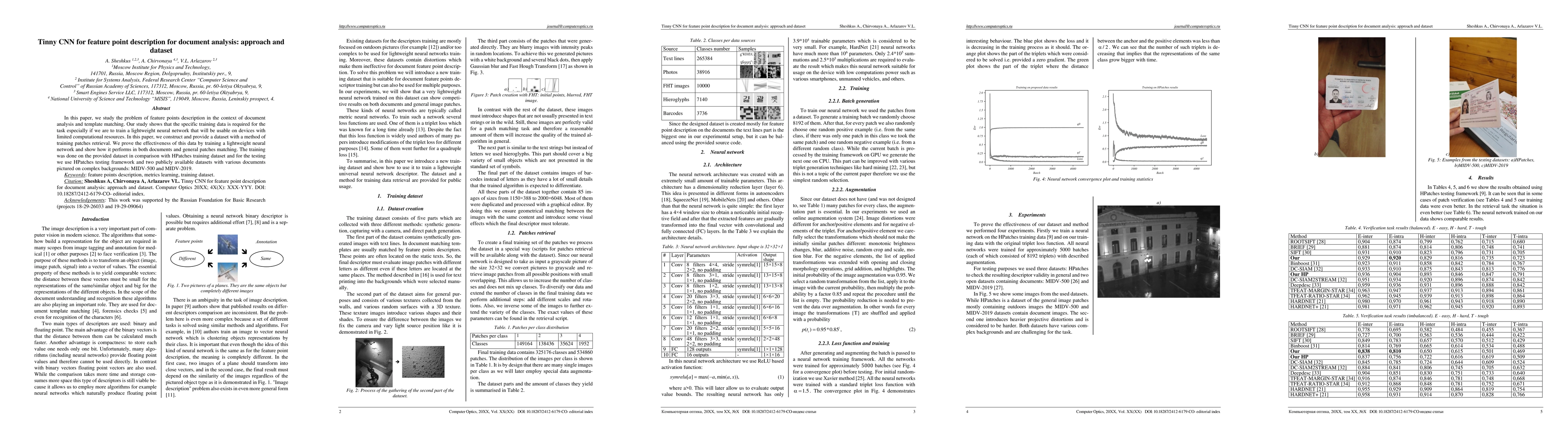 This paper presents a lightweight CNN for describing feature points in document analysis, emphasizing the need for specific training data for devices with limited resources. The authors construct and provide a training dataset, proving its effectiveness by comparing it with HPatches. The method is tested on HPatches framework and two public document datasets, MIDV-500 and MIDV-2019, demonstrating successful performance in both document and general patch matching.