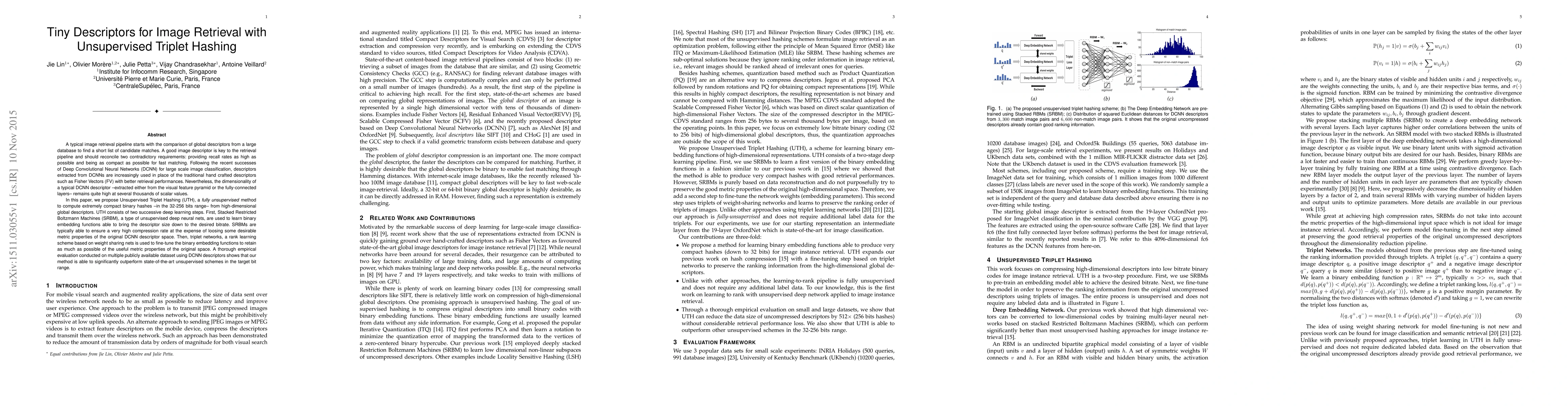 This paper proposes Unsupervised Triplet Hashing (UTH) to generate compact binary hashes from high-dimensional descriptors from Deep Convolutional Neural Networks (DCNNs) for efficient image retrieval. The method uses Stacked Restricted Boltzmann Machines to compress descriptors and triplet networks to fine-tune the embeddings, achieving high recall rates while maintaining compactness.