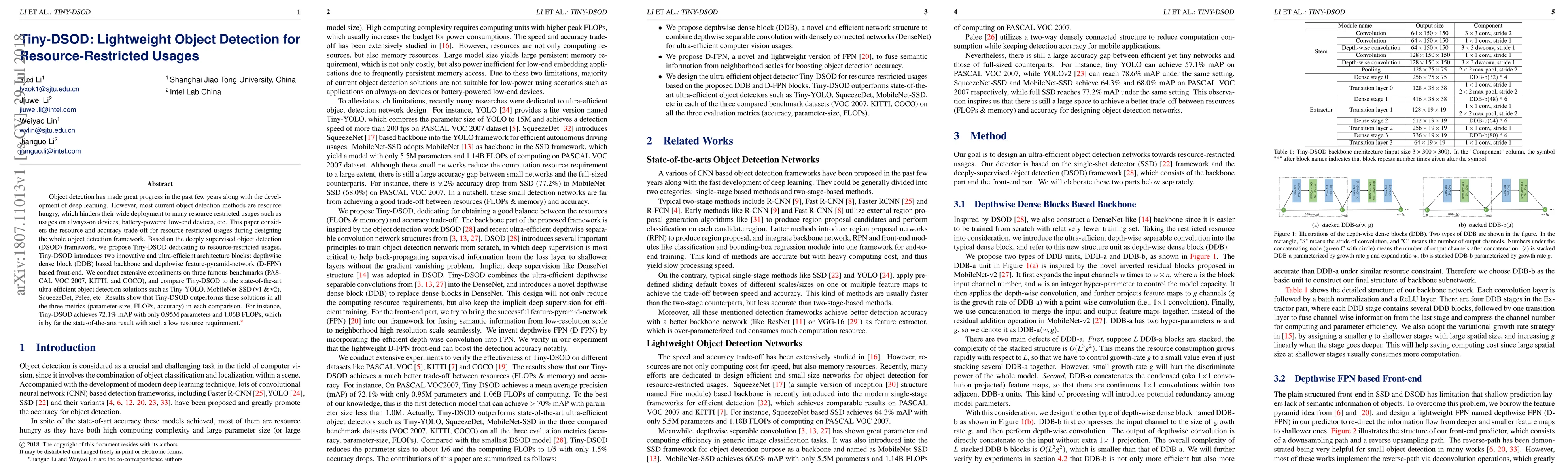 This paper proposes Tiny-DSOD, a lightweight object detection framework designed for resource-restricted devices, achieving superior performance in terms of parameter size, computational efficiency, and accuracy compared to other ultra-efficient detection methods like Tiny-YOLO and MobileNet-SSD. Tiny-DSOD utilizes innovative depthwise dense blocks and depthwise feature-pyramid networks to optimize resource usage while maintaining high detection accuracy.