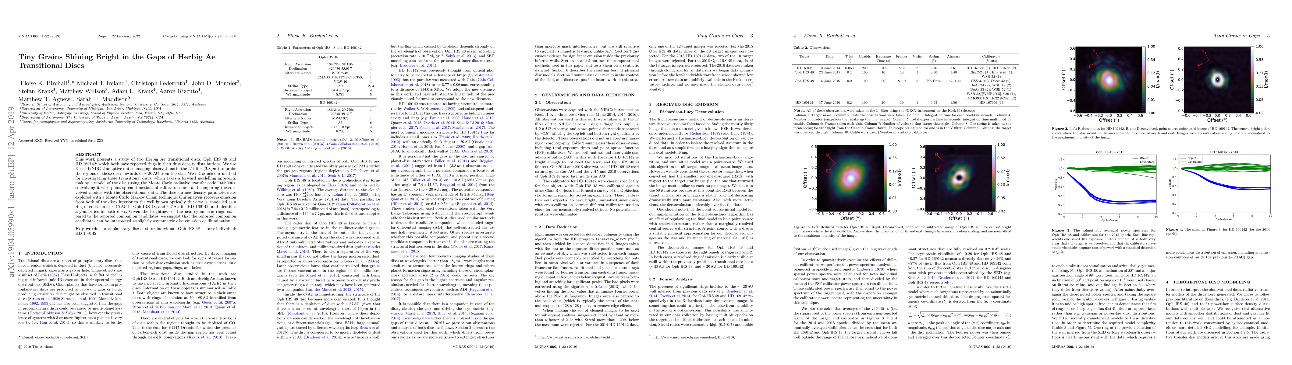 This work presents a study of two Herbig Ae transitional discs, Oph IRS 48 and HD 169142; which both have reported rings in their dust density distributions. We use Keck-II/NIRC2 adaptive optics imaging observations in the L' filter (3.8 micron) to probe the regions of these discs inwards of ~20AU from the star. We introduce our method for investigating these transitional discs, which takes a forward modelling approach: making a model of the disc (using the Monte Carlo radiative transfer code RADMC), convolving it with point-spread functions of calibrator stars, and comparing the convolved models with the observational data. The disc surface density parameters are explored with a Monte Carlo Markov Chain technique. Our analysis recovers emission from both of the discs interior to the well known optically thick walls, modelled as a ring of emission at ~15AU in Oph IRS 48, and ~7AU for HD 169142, and identifies asymmetries in both discs. Given the brightness of the near-symmetric rings compared to the reported companion candidates, we suggest that the reported companion candidates can be interpreted as slightly asymmetric disc emission or illumination.