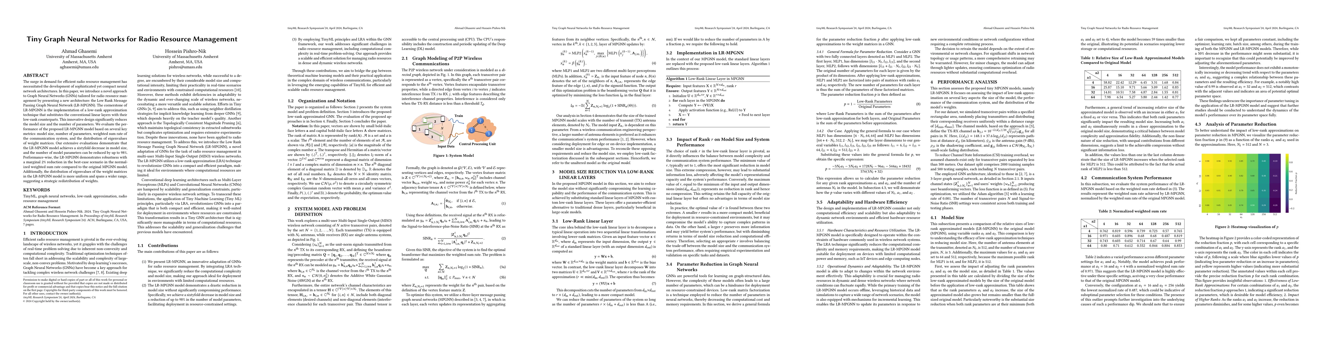 The surge in demand for efficient radio resource management has necessitated the development of sophisticated yet compact neural network architectures. In this paper, we introduce a novel approach to Graph Neural Networks (GNNs) tailored for radio resource management by presenting a new architecture: the Low Rank Message Passing Graph Neural Network (LR-MPGNN). The cornerstone of LR-MPGNN is the implementation of a low-rank approximation technique that substitutes the conventional linear layers with their low-rank counterparts. This innovative design significantly reduces the model size and the number of parameters. We evaluate the performance of the proposed LR-MPGNN model based on several key metrics: model size, number of parameters, weighted sum rate of the communication system, and the distribution of eigenvalues of weight matrices. Our extensive evaluations demonstrate that the LR-MPGNN model achieves a sixtyfold decrease in model size, and the number of model parameters can be reduced by up to 98%. Performance-wise, the LR-MPGNN demonstrates robustness with a marginal 2% reduction in the best-case scenario in the normalized weighted sum rate compared to the original MPGNN model. Additionally, the distribution of eigenvalues of the weight matrices in the LR-MPGNN model is more uniform and spans a wider range, suggesting a strategic redistribution of weights.
