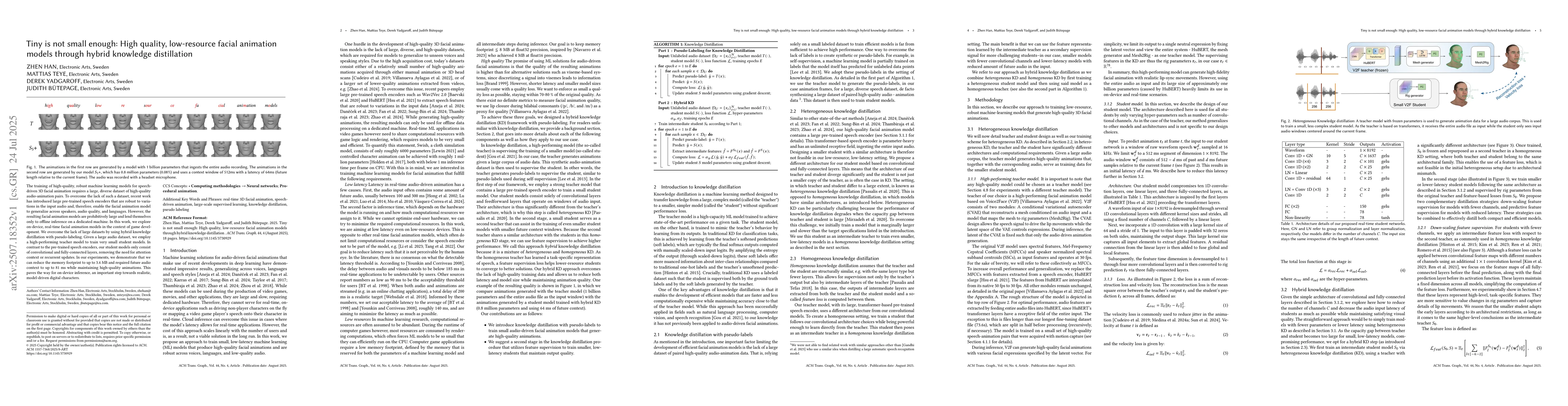 The training of high-quality, robust machine learning models for speech-driven 3D facial animation requires a large, diverse dataset of high-quality audio-animation pairs. To overcome the lack of such a dataset, recent work has introduced large pre-trained speech encoders that are robust to variations in the input audio and, therefore, enable the facial animation model to generalize across speakers, audio quality, and languages. However, the resulting facial animation models are prohibitively large and lend themselves only to offline inference on a dedicated machine. In this work, we explore on-device, real-time facial animation models in the context of game development. We overcome the lack of large datasets by using hybrid knowledge distillation with pseudo-labeling. Given a large audio dataset, we employ a high-performing teacher model to train very small student models. In contrast to the pre-trained speech encoders, our student models only consist of convolutional and fully-connected layers, removing the need for attention context or recurrent updates. In our experiments, we demonstrate that we can reduce the memory footprint to up to 3.4 MB and required future audio context to up to 81 ms while maintaining high-quality animations. This paves the way for on-device inference, an important step towards realistic, model-driven digital characters.