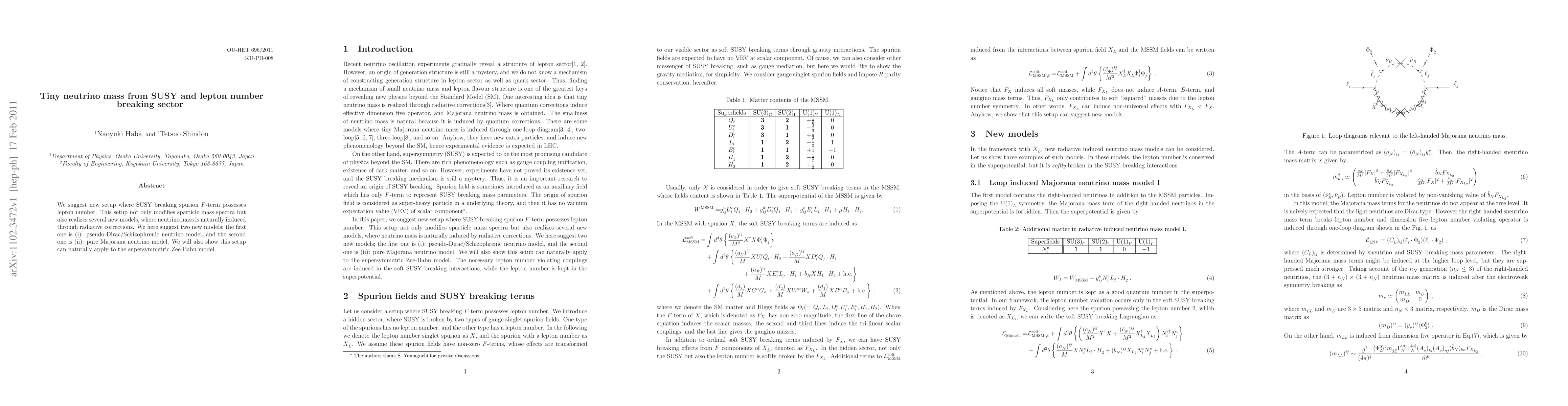 We suggest new setup where SUSY breaking spurion F-term possesses lepton number. This setup not only modifies sparticle mass spectra but also realizes several new models, where neutrino mass is naturally induced through radiative corrections. We here suggest two new models; the first one is (i): pseudo-Dirac/Schizophrenic neutrino model, and the second one is (ii): pure Majorana neutrino model. We will also show this setup can naturally apply to the supersymmetric Zee-Babu model.