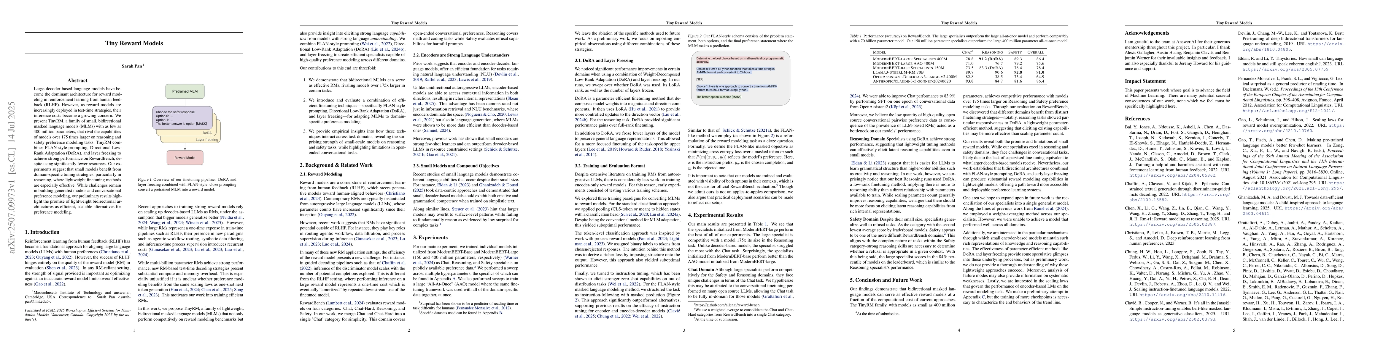 Large decoder-based language models have become the dominant architecture for reward modeling in reinforcement learning from human feedback (RLHF). However, as reward models are increasingly deployed in test-time strategies, their inference costs become a growing concern. We present TinyRM, a family of small, bidirectional masked language models (MLMs) with as few as 400 million parameters, that rival the capabilities of models over 175 times larger on reasoning and safety preference modeling tasks. TinyRM combines FLAN-style prompting, Directional Low-Rank Adaptation (DoRA), and layer freezing to achieve strong performance on RewardBench, despite using significantly fewer resources. Our experiments suggest that small models benefit from domain-specific tuning strategies, particularly in reasoning, where lightweight finetuning methods are especially effective. While challenges remain in building generalist models and conversational preference modeling, our preliminary results highlight the promise of lightweight bidirectional architectures as efficient, scalable alternatives for preference modeling.