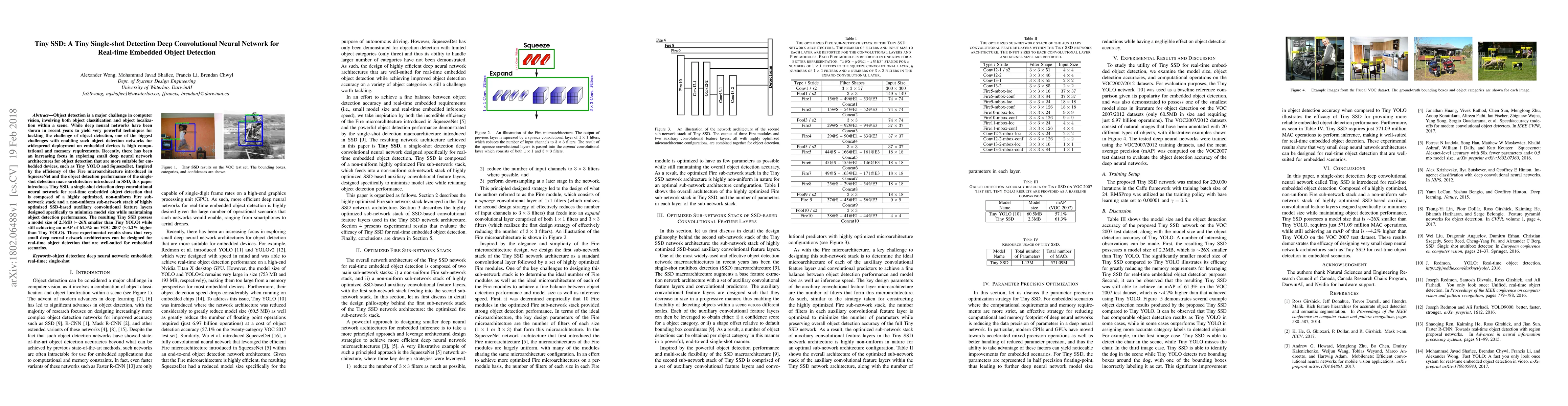 Tiny SSD presents a highly optimized deep convolutional neural network for real-time embedded object detection, combining the efficiency of Fire microarchitecture with SSD's detection performance. The resulting model is 2.3MB in size, achieving an mAP of 61.3% on VOC 2007, demonstrating its effectiveness for resource-constrained environments.