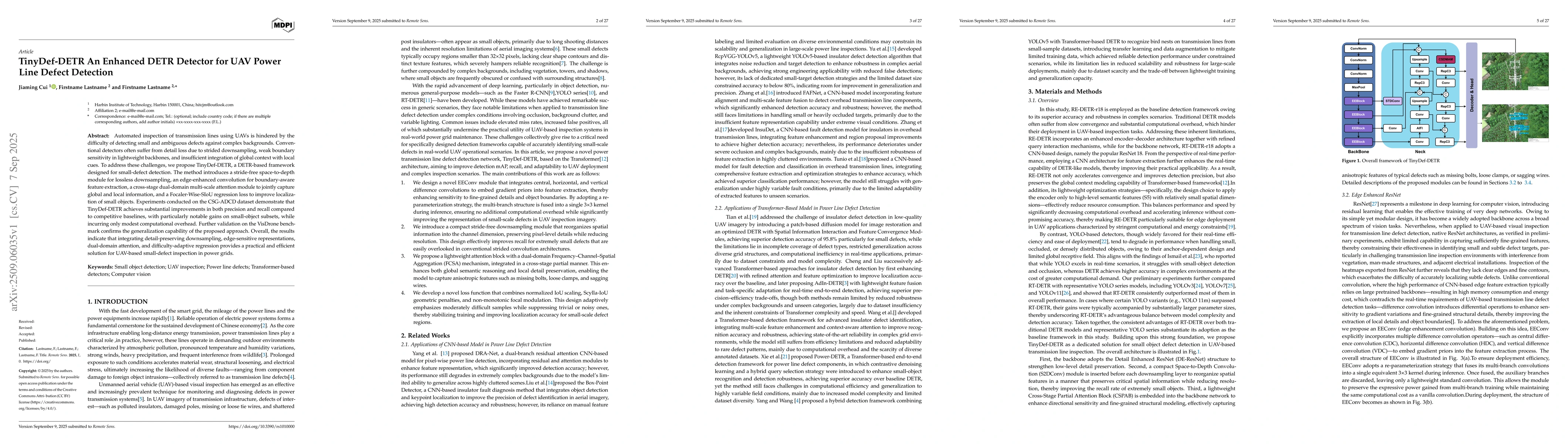 Automated inspection of transmission lines using UAVs is hindered by the difficulty of detecting small and ambiguous defects against complex backgrounds. Conventional detectors often suffer from detail loss due to strided downsampling, weak boundary sensitivity in lightweight backbones, and insufficient integration of global context with local cues. To address these challenges, we propose TinyDef-DETR, a DETR-based framework designed for small-defect detection. The method introduces a stride-free space-to-depth module for lossless downsampling, an edge-enhanced convolution for boundary-aware feature extraction, a cross-stage dual-domain multi-scale attention module to jointly capture global and local information, and a Focaler-Wise-SIoU regression loss to improve localization of small objects. Experiments conducted on the CSG-ADCD dataset demonstrate that TinyDef-DETR achieves substantial improvements in both precision and recall compared to competitive baselines, with particularly notable gains on small-object subsets, while incurring only modest computational overhead. Further validation on the VisDrone benchmark confirms the generalization capability of the proposed approach. Overall, the results indicate that integrating detail-preserving downsampling, edge-sensitive representations, dual-domain attention, and difficulty-adaptive regression provides a practical and efficient solution for UAV-based small-defect inspection in power grids.