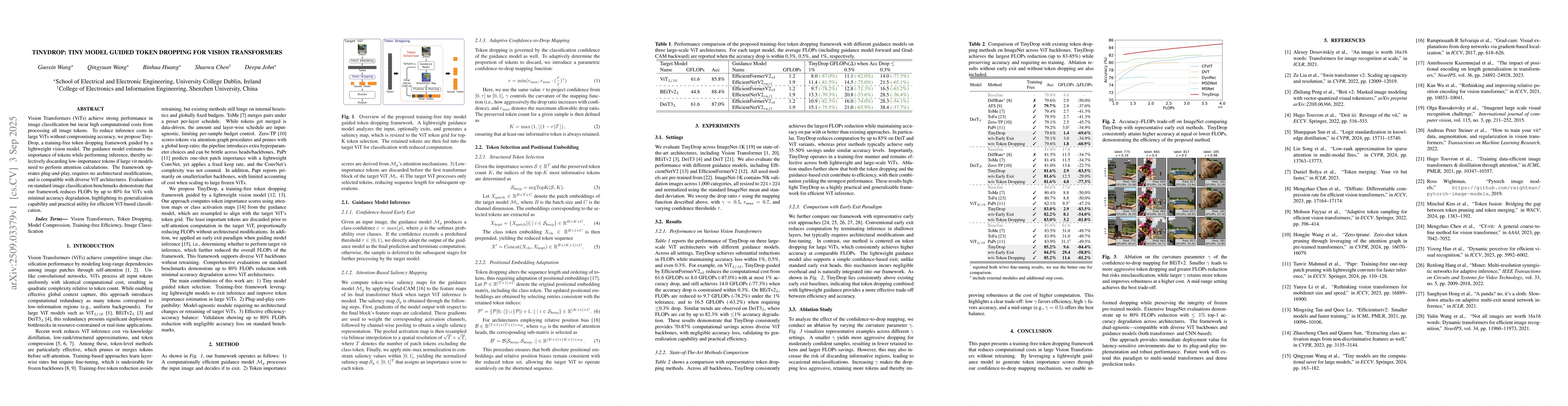 Vision Transformers (ViTs) achieve strong performance in image classification but incur high computational costs from processing all image tokens. To reduce inference costs in large ViTs without compromising accuracy, we propose TinyDrop, a training-free token dropping framework guided by a lightweight vision model. The guidance model estimates the importance of tokens while performing inference, thereby selectively discarding low-importance tokens if large vit models need to perform attention calculations. The framework operates plug-and-play, requires no architectural modifications, and is compatible with diverse ViT architectures. Evaluations on standard image classification benchmarks demonstrate that our framework reduces FLOPs by up to 80% for ViTs with minimal accuracy degradation, highlighting its generalization capability and practical utility for efficient ViT-based classification.