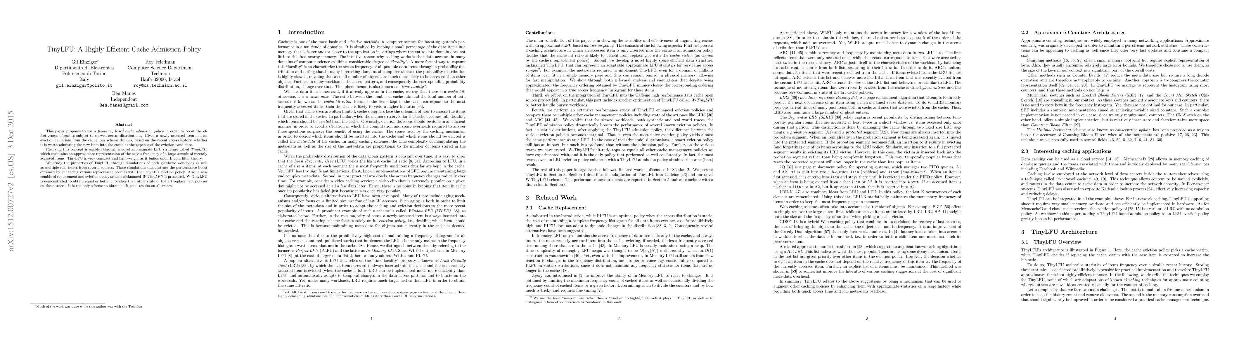 A new cache admission policy called TinyLFU is proposed to boost cache effectiveness in skewed access distributions, achieving better performance boosts than existing policies through a novel approximate LFU structure.