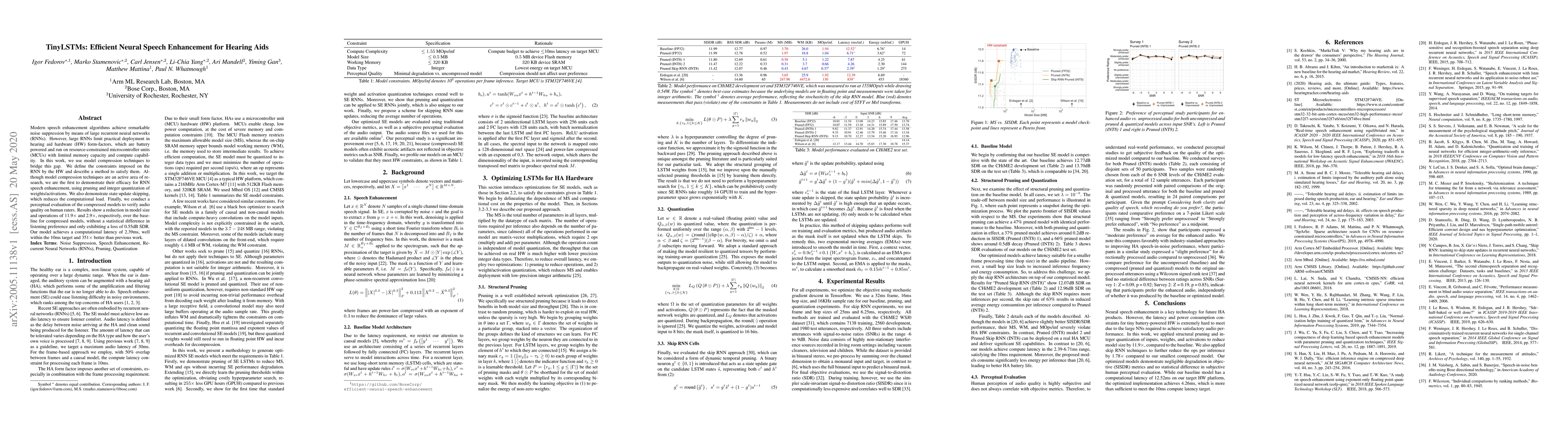 This paper presents TinyLSTMs, an efficient neural network for speech enhancement tailored for hearing aids, utilizing model compression techniques like pruning, quantization, and state update skipping to reduce model size and computational load while maintaining audio quality. The compressed model achieves a 11.9× reduction in size and 2.9× in operations, with minimal loss in listening preference and a latency of 2.39ms.