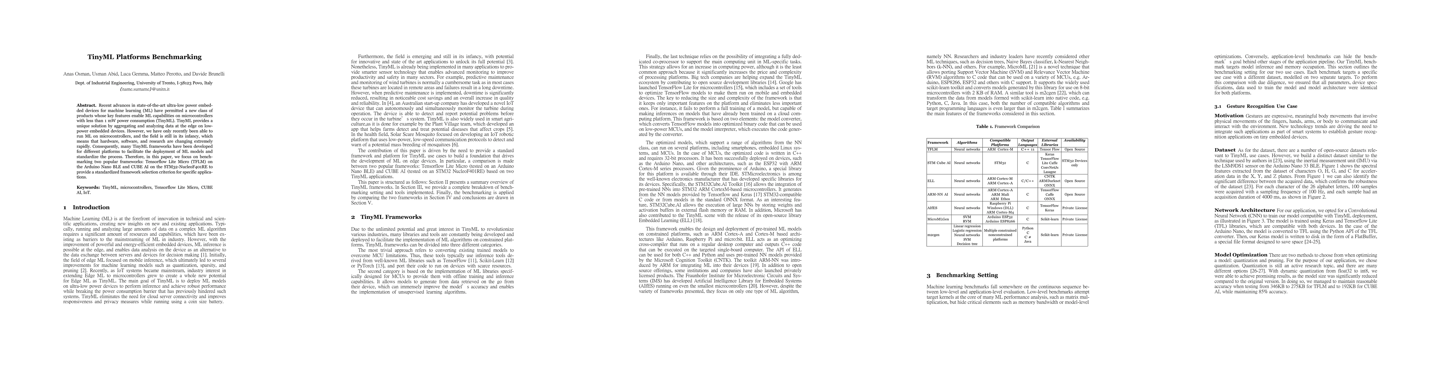 This paper benchmarks two TinyML frameworks, Tensorflow Lite Micro on Arduino Nano BLE and CUBE AI on STM32-NucleoF401RE, to evaluate their performance and provide a standardized criterion for selecting the best framework for specific applications in the rapidly evolving field of ultra-low power machine learning.