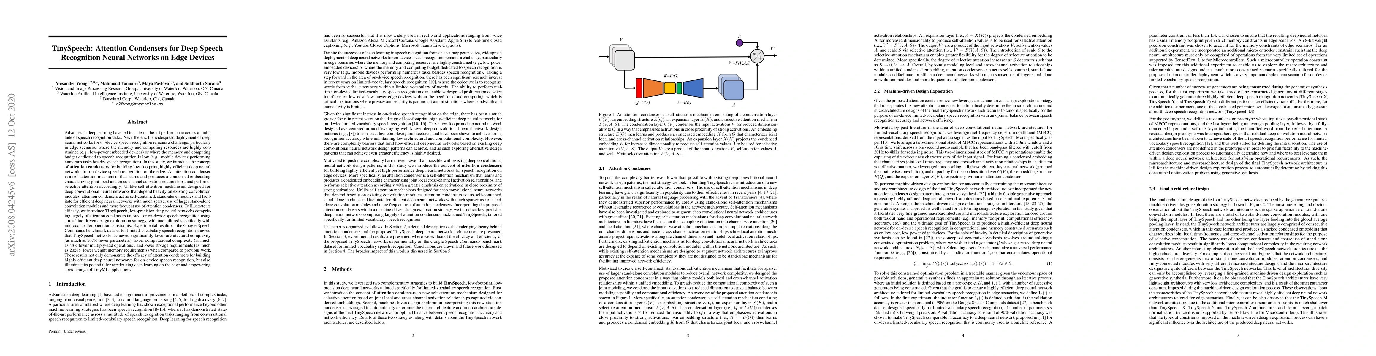 Advances in deep learning have led to state-of-the-art performance across a multitude of speech recognition tasks. Nevertheless, the widespread deployment of deep neural networks for on-device speech recognition remains a challenge, particularly in edge scenarios where the memory and computing resources are highly constrained (e.g., low-power embedded devices) or where the memory and computing budget dedicated to speech recognition is low (e.g., mobile devices performing numerous tasks besides speech recognition). In this study, we introduce the concept of attention condensers for building low-footprint, highly-efficient deep neural networks for on-device speech recognition on the edge. An attention condenser is a self-attention mechanism that learns and produces a condensed embedding characterizing joint local and cross-channel activation relationships, and performs selective attention accordingly. To illustrate its efficacy, we introduce TinySpeech, low-precision deep neural networks comprising largely of attention condensers tailored for on-device speech recognition using a machine-driven design exploration strategy, with one tailored specifically with microcontroller operation constraints. Experimental results on the Google Speech Commands benchmark dataset for limited-vocabulary speech recognition showed that TinySpeech networks achieved significantly lower architectural complexity (as much as $507\times$ fewer parameters), lower computational complexity (as much as $48\times$ fewer multiply-add operations), and lower storage requirements (as much as $2028\times$ lower weight memory requirements) when compared to previous work. These results not only demonstrate the efficacy of attention condensers for building highly efficient networks for on-device speech recognition, but also illuminate its potential for accelerating deep learning on the edge and empowering TinyML applications.