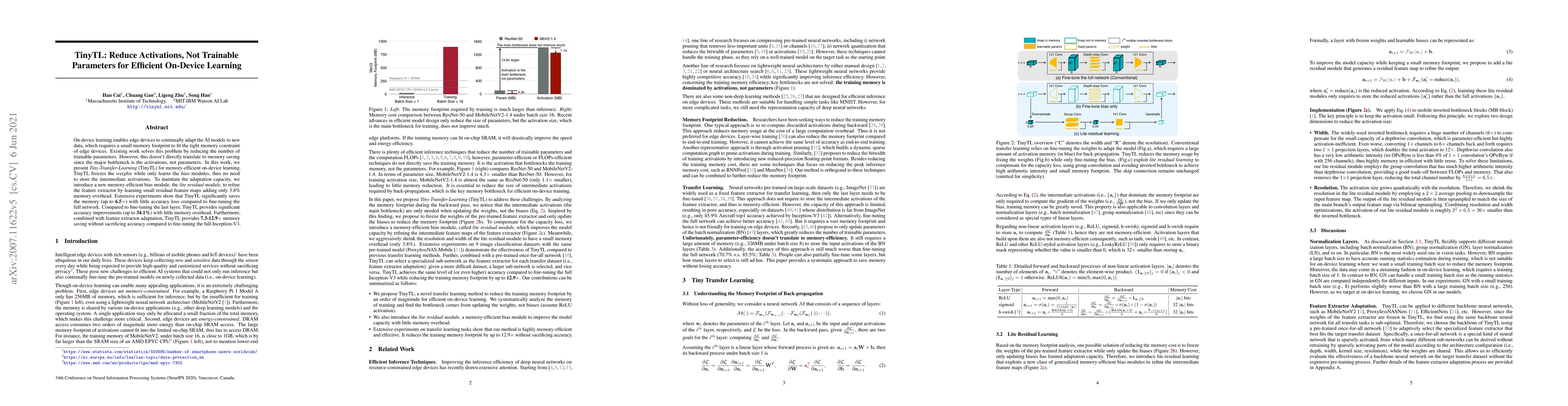 The research introduces TinyTL, a method for memory-efficient on-device learning that freezes weights and only updates bias modules, significantly reducing memory usage (up to 6.5x) with minor accuracy loss. It also presents a memory-efficient bias module, lite residual module, enhancing adaptation capacity. TinyTL outperforms fine-tuning last layer and full network fine-tuning in terms of memory savings and accuracy.