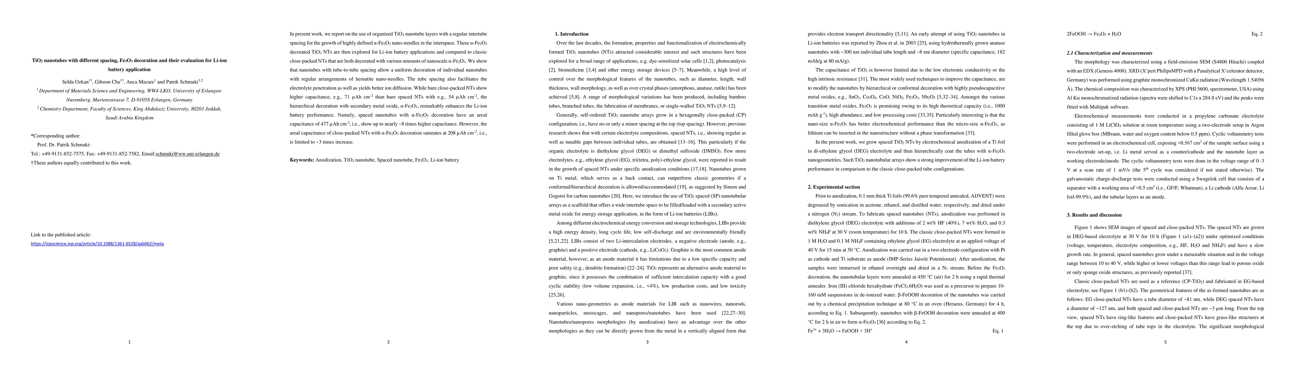 In present work, we report on the use of organized TiO$_2$ nanotube layers with a regular intertube spacing for the growth of highly defined $\alpha$-Fe$_2$O$_3$ nano-needles in the interspace. These $\alpha$-Fe$_2$O$_3$ decorated TiO$_2$ NTs are then explored for Li-ion battery applications and compared to classic close-packed NTs that are both decorated with various amounts of nanoscale $\alpha$-Fe$_2$O$_3$. We show that nanotubes with tube-to-tube spacing allow a uniform decoration of individual nanotubes with regular arrangements of hematite nano-needles. The tube spacing also facilitates the electrolyte penetration as well as yields better ion diffusion. While bare close-packed NTs show higher capacitance, e.g., 71 $\mu$Ah cm-2 than bare spaced NTs with e.g., 54 $\mu$Ah cm-2, the hierarchical decoration with secondary metal oxide, $\alpha$-Fe$_2$O$_3$, remarkably enhances the Li-ion battery performance. Namely, spaced nanotubes with $\alpha$-Fe$_2$O$_3$ decoration have an areal capacitance of 477 $\mu$Ah cm-2, i.e., show up to nearly ~8 times higher capacitance. However, the areal capacitance of close-packed NTs with $\alpha$-Fe$_2$O$_3$ decoration saturates at 208 $\mu$Ah cm-2, i.e., is limited to ~3 times increase.