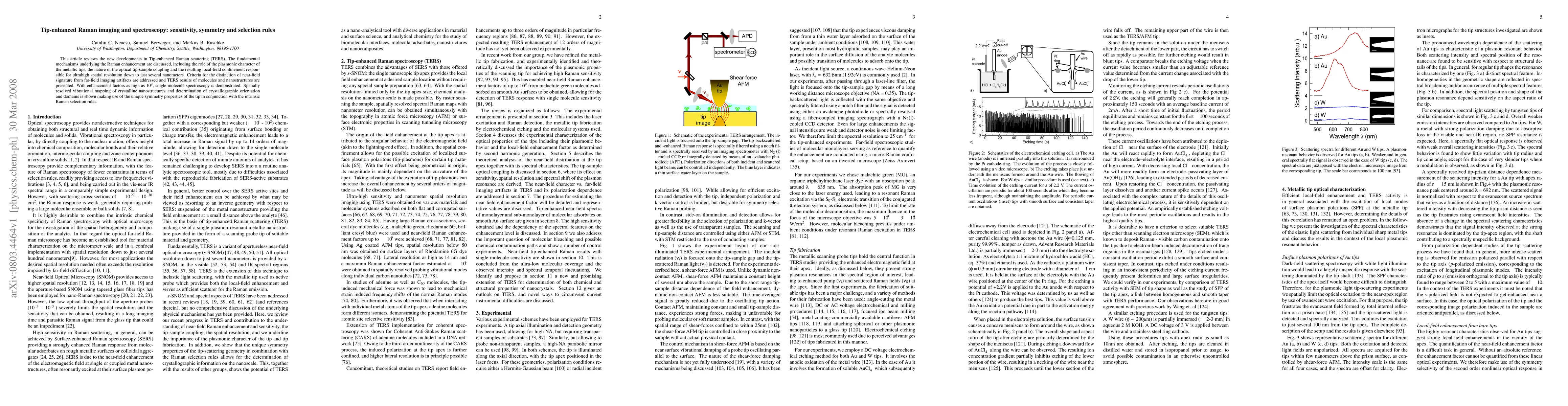 This paper reviews advancements in Tip-enhanced Raman scattering (TERS), focusing on the mechanisms of Raman enhancement via plasmonic metallic tips and optical coupling, achieving spatial resolutions down to several nanometers. It demonstrates single molecule spectroscopy and spatially resolved vibrational mapping, highlighting the use of TERS for determining crystallographic orientation and domains.