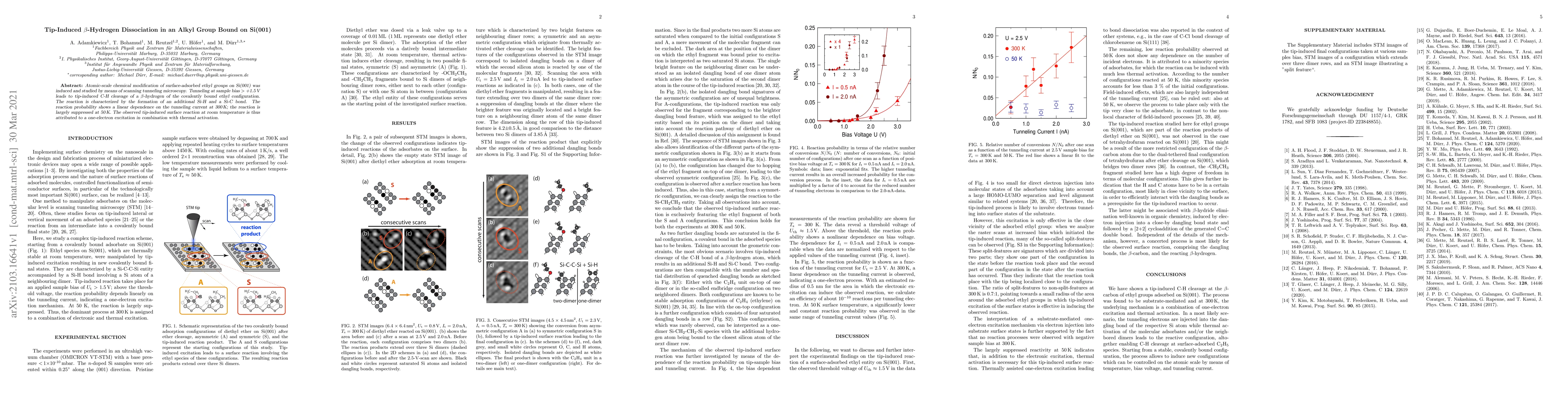 This study investigates tip-induced $\beta$-hydrogen dissociation in ethyl groups on Si(001) using scanning tunneling microscopy, revealing C-H cleavage at biases > +1.5V, forming Si-H and Si-C bonds. The reaction probability linearly depends on the tunneling current at 300 K, indicating a one-electron excitation and thermal activation mechanism.