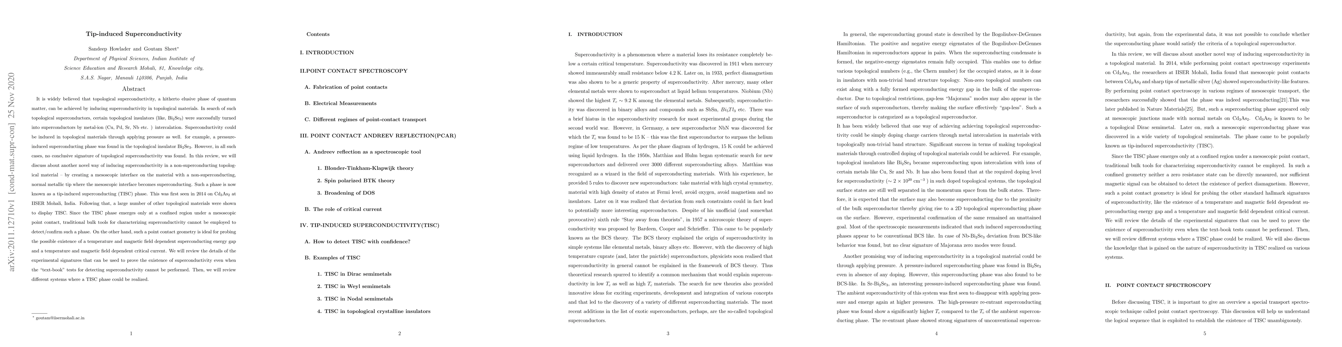 It is widely believed that topological superconductivity, a hitherto elusive phase of quantum matter, can be achieved by inducing superconductivity in topological materials. In search of such topological superconductors, certain topological insulators (like, Bi$_2$Se$_3$) were successfully turned into superconductors by metal-ion (Cu, Pd, Sr, Nb etc. ) intercalation. Superconductivity could be induced in topological materials through applying pressure as well. for example, a pressure-induced superconducting phase was found in the topological insulator Bi$_2$Se$_3$. However, in all such cases, no conclusive signature of topological superconductivity was found. In this review, we will discuss about another novel way of inducing superconductivity in a non-superconducting topological material -- by creating a mesoscopic interface on the material with a non-superconducting, normal metallic tip where the mesoscopic interface becomes superconducting. Such a phase is now known as a tip-induced superconducting (TISC) phase. This was first seen in 2014 on Cd$_3$As$_2$ at IISER Mohali, India. Following that, a large number of other topological materials were shown to display TISC. Since the TISC phase emerges only at a confined region under a mesoscopic point contact, traditional bulk tools for characterizing superconductivity cannot be employed to detect/confirm such a phase. On the other hand, such a point contact geometry is ideal for probing the possible existence of a temperature and magnetic field dependent superconducting energy gap and a temperature and magnetic field dependent critical current. We will review the details of the experimental signatures that can be used to prove the existence of superconductivity even when the "text-book" tests for detecting superconductivity cannot be performed. Then, we will review different systems where a TISC phase could be realized.