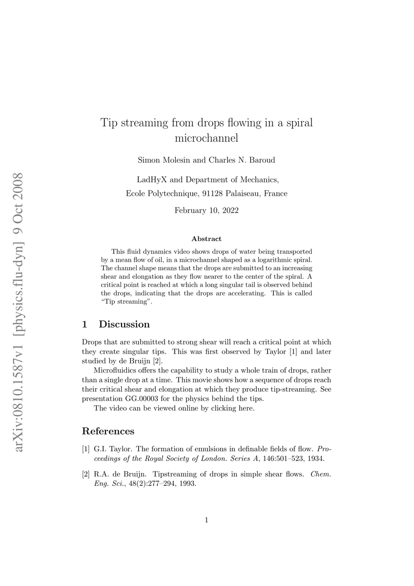 This study investigates the phenomenon of "Tip streaming" where water drops in a spiral microchannel experience increasing shear and elongation, leading to the formation of a long tail behind them as they accelerate. The unique shape of the channel induces these dynamic behaviors in the drops.