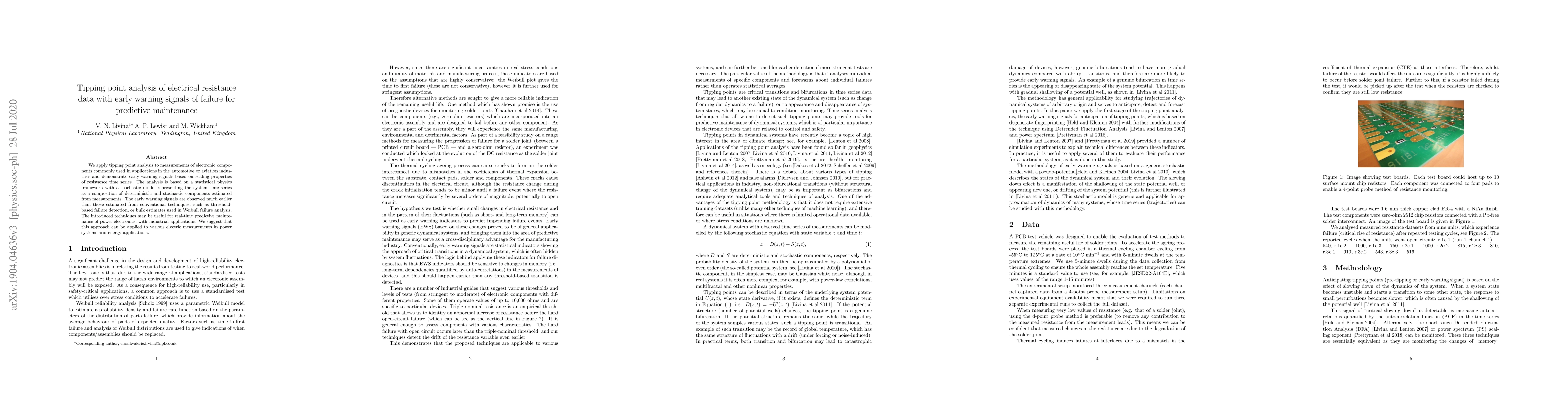 The paper presents a tipping point analysis for electronic components' resistance data to identify early warning signals of failure, employing a statistical physics framework with stochastic modelling. The approach provides more timely early warning signals than conventional methods, potentially aiding predictive maintenance in automotive and aviation industries.