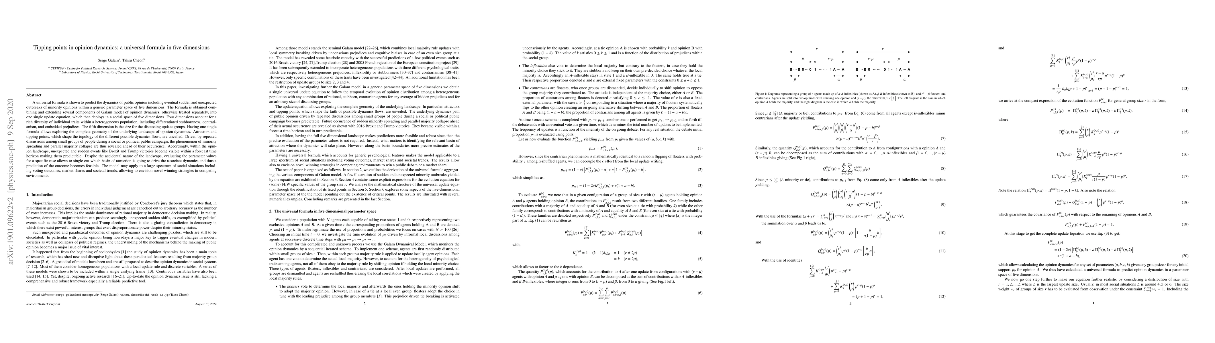 Researchers developed a universal formula to predict opinion dynamics in five dimensions, revealing unexpected tipping points and minority outbreaks, enabling predictions of social events like Brexit and Trump victories.