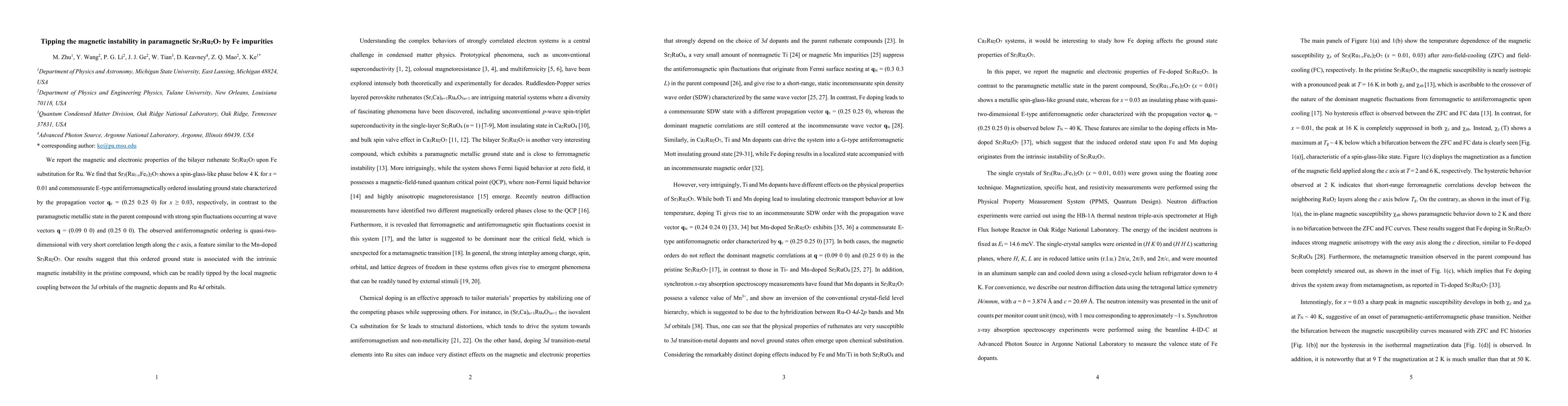 The study investigates Fe doping in Sr$_3$Ru$_2$O$_7$, revealing spin-glass-like behavior at low temperatures for small Fe concentrations and a transition to a commensurate antiferromagnetic insulating state for higher Fe concentrations, contrasting with the parent compound's paramagnetic metallic state. This suggests the pristine compound's magnetic instability can be influenced by local magnetic interactions between dopant and host orbitals.
