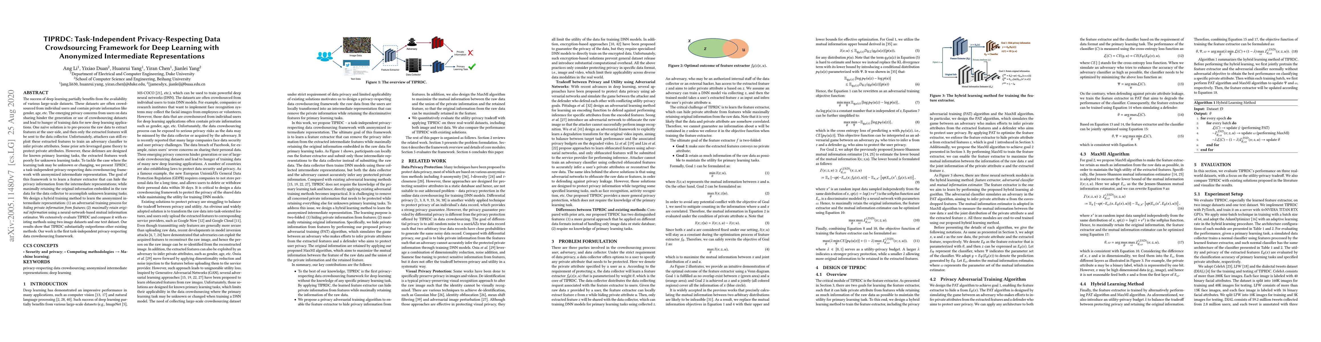 TIPRDC introduces a task-independent privacy-respecting data crowdsourcing framework that anonymizes intermediate representations to protect private information while retaining useful data for deep learning tasks. It employs adversarial training and a neural-network-based mutual information estimator to achieve this balance.