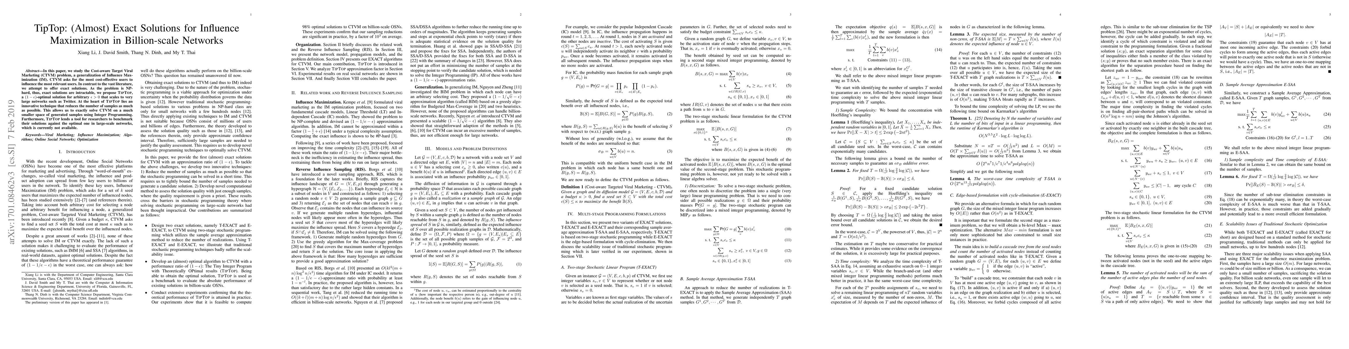 In this paper, we study the Cost-aware Target Viral Marketing (CTVM) problem, a generalization of Influence Maximization (IM). CTVM asks for the most cost-effective users to influence the most relevant users. In contrast to the vast literature, we attempt to offer exact solutions. As the problem is NP-hard, thus, exact solutions are intractable, we propose TipTop, a $(1-\epsilon)$-optimal solution for arbitrary $\epsilon>0$ that scales to very large networks such as Twitter. At the heart of TipTop lies an innovative technique that reduces the number of samples as much as possible. This allows us to exactly solve CTVM on a much smaller space of generated samples using Integer Programming. Furthermore, TipTop lends a tool for researchers to benchmark their solutions against the optimal one in large-scale networks, which is currently not available.