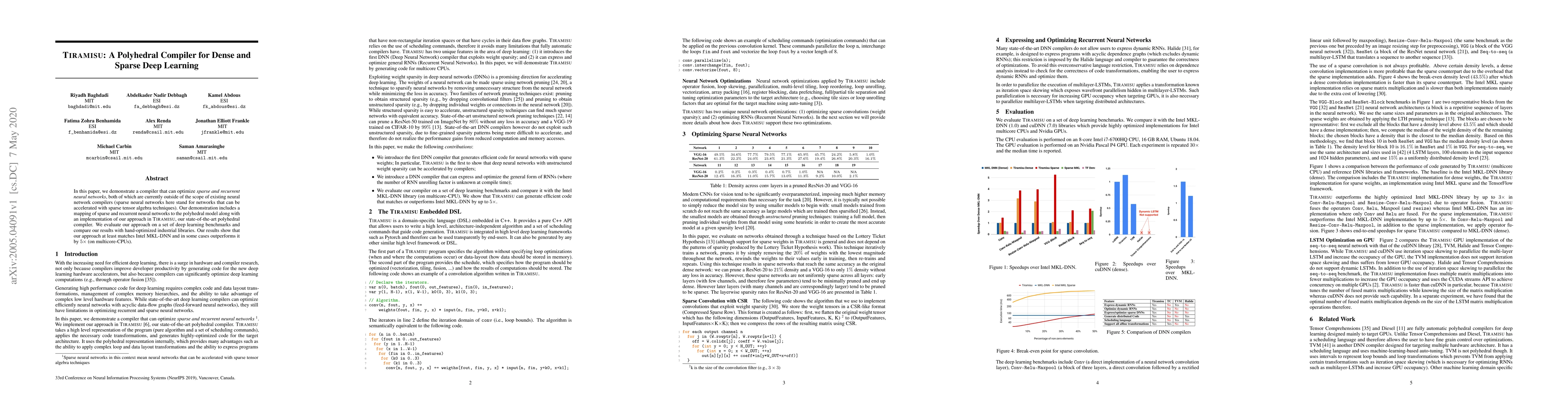 TIRAMISU is a novel polyhedral compiler designed to optimize sparse and recurrent neural networks, achieving competitive performance against hand-optimized industrial libraries like Intel MKL-DNN, with some benchmarks showing up to 5x improvement on multicore CPUs.
