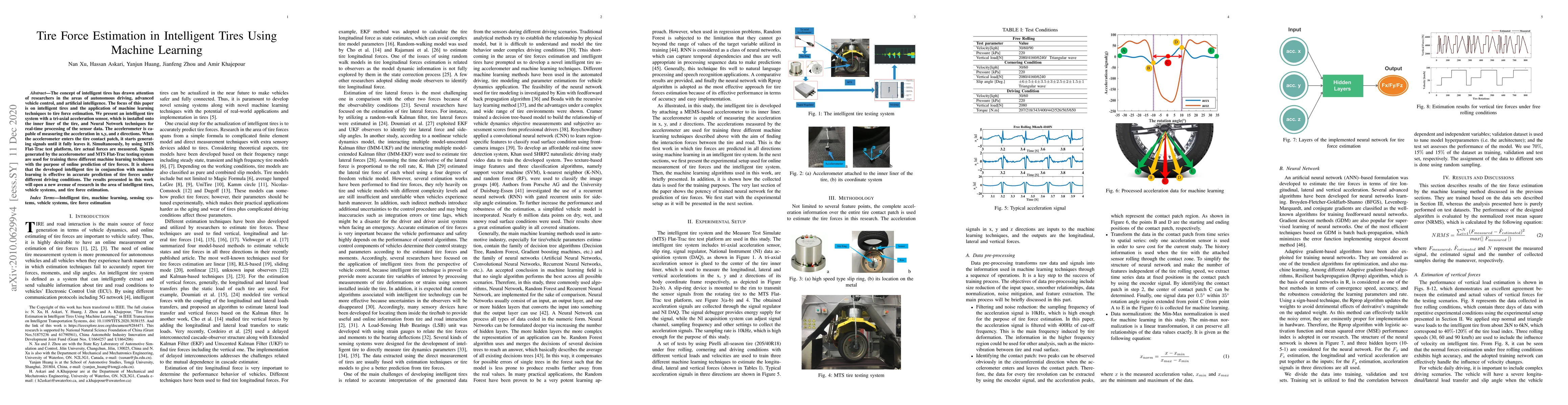 The concept of intelligent tires has drawn attention of researchers in the areas of autonomous driving, advanced vehicle control, and artificial intelligence. The focus of this paper is on intelligent tires and the application of machine learning techniques to tire force estimation. We present an intelligent tire system with a tri-axial acceleration sensor, which is installed onto the inner liner of the tire, and Neural Network techniques for real-time processing of the sensor data. The accelerometer is capable of measuring the acceleration in x,y, and z directions. When the accelerometer enters the tire contact patch, it starts generating signals until it fully leaves it. Simultaneously, by using MTS Flat-Trac test platform, tire actual forces are measured. Signals generated by the accelerometer and MTS Flat-Trac testing system are used for training three different machine learning techniques with the purpose of online prediction of tire forces. It is shown that the developed intelligent tire in conjunction with machine learning is effective in accurate prediction of tire forces under different driving conditions. The results presented in this work will open a new avenue of research in the area of intelligent tires, vehicle systems, and tire force estimation.